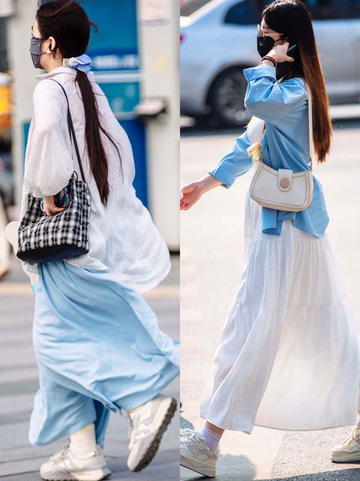 觉得纯色太单调?可以试试小碎花、波点或者条纹款。浅底色的印花长裙搭配帆布鞋,立马穿出韩系少女感,减龄又时髦。