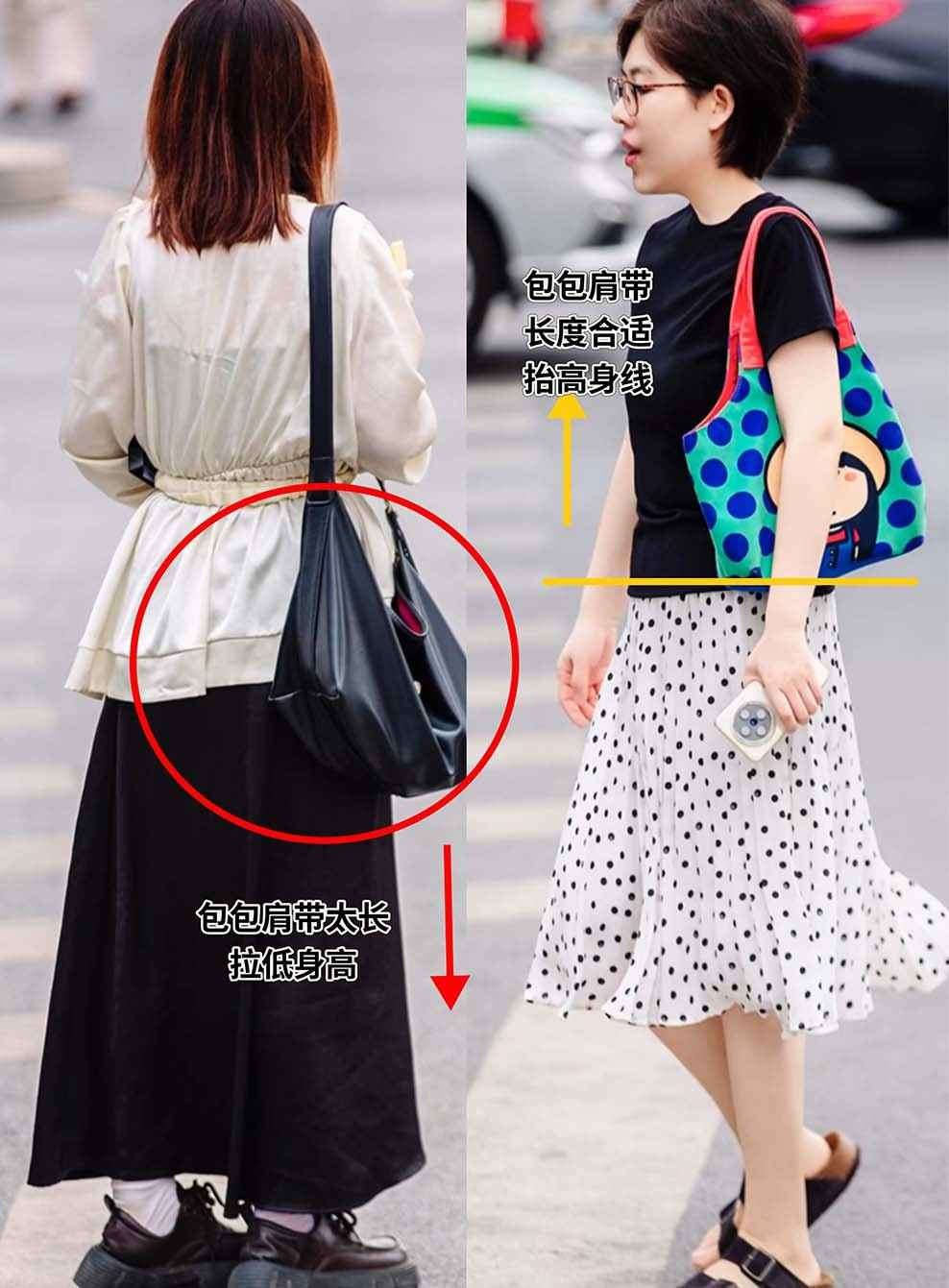 穿高腰长裙时背个腰包,或者用胸包强调腰线,都能让腿长瞬间增加5厘米,小个子也能穿出大气场。