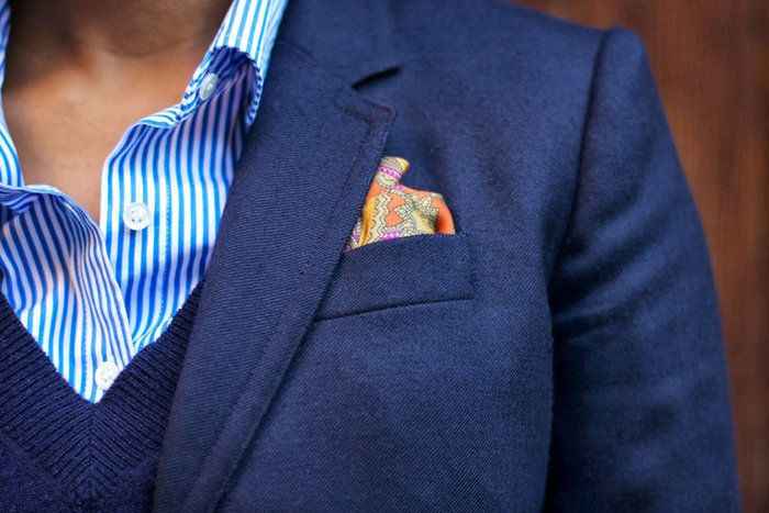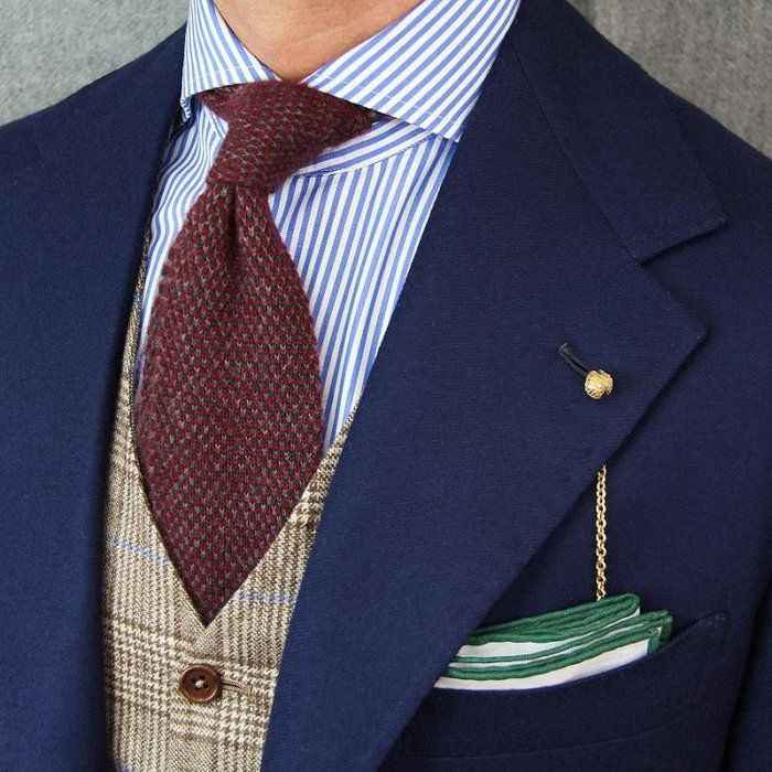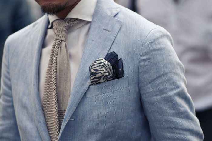 搭配口袋巾其实很简单,记住两个原则:颜色呼应或材质对比。