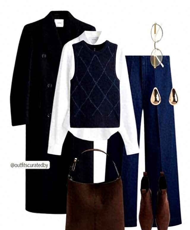 白衬衫别再穿成工装范儿,选个弧线下摆的款式,长度盖过胯部,能巧妙隐藏腰粗问题。外面搭一件菱格针织背心,领口露出一点白边,层次感立马出来。下身配高腰微喇牛仔裤,裤脚盖住鞋面,再穿双方头踝靴,只露一截靴筒,腿长效果满分。风大时披上黑色H型大衣,扣子别全系,留中间两颗,走路带风却不臃肿。整套搭配简单快速,出门自带气场。
