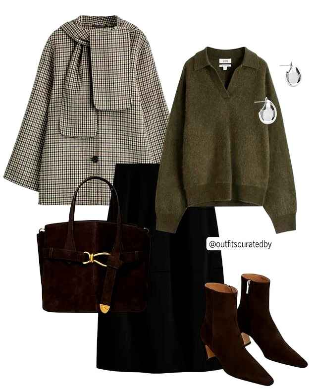伞型半裙对胯宽友好,腰部打褶藏肚子,下摆散开显瘦。橄榄绿马海毛毛衣柔软模糊肩线,增加温柔感。黑白格纹呢子外套比纯色更吸睛,扣子只系中间。燕麦色围巾绕两圈塞好,防风又时尚。整套颜色不超过三种,简洁却有内涵。