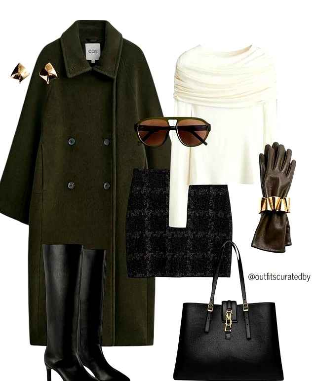 格纹短裙穿出成熟感,选深棕底细红线,裙摆在膝盖上方两公分。军绿色廓形大衣长到小腿,腰带系得松散随意。黑色哑光直筒靴鞋头适中,中性风平衡整体。小羊皮手套是亮点,手指动作像翻书般优雅。