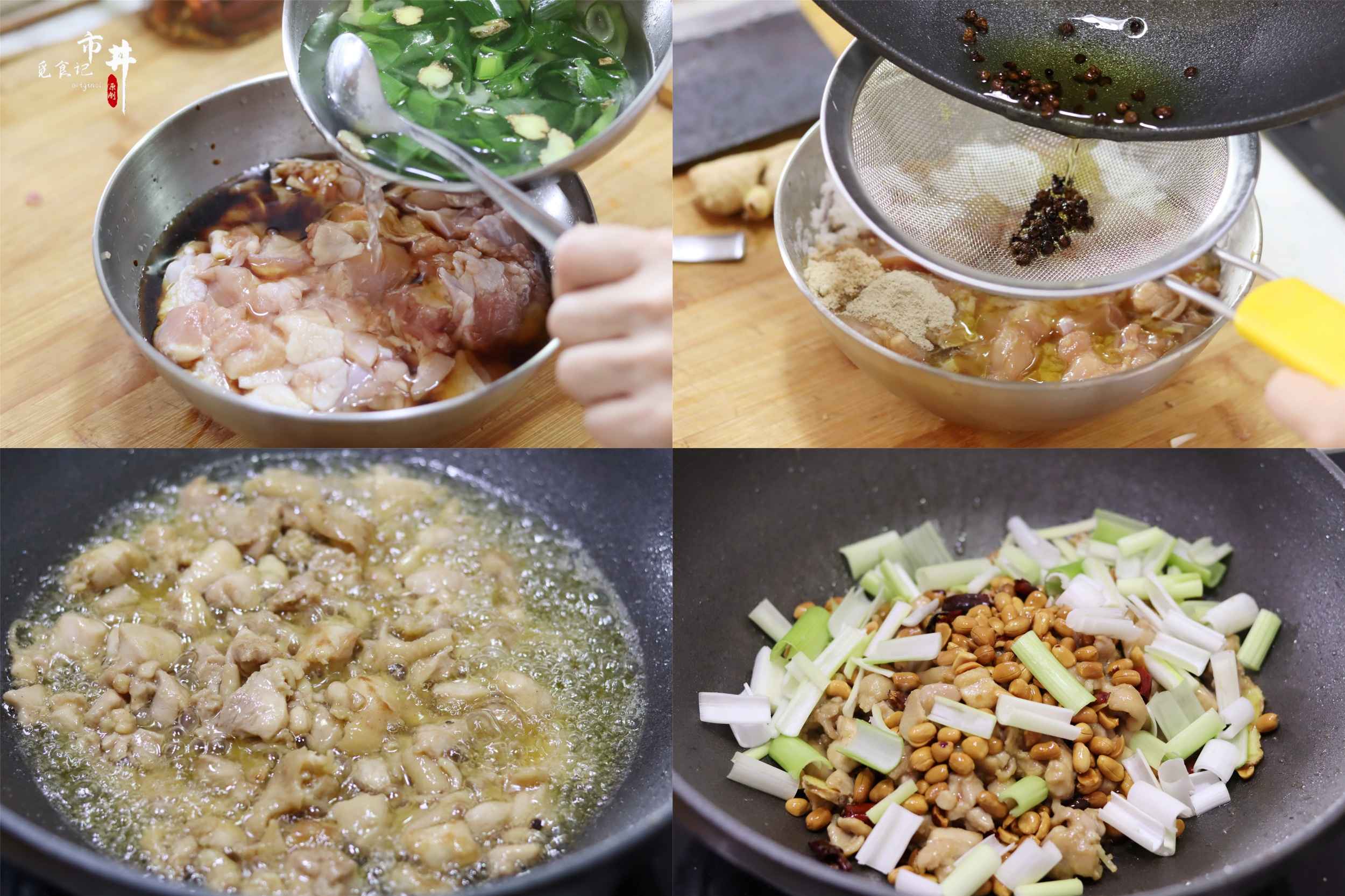 6、锅里留少许油,放姜片和干辣椒炒香,倒入鸡丁翻炒均匀,加花生米和葱段,开大火快速炒出香味。