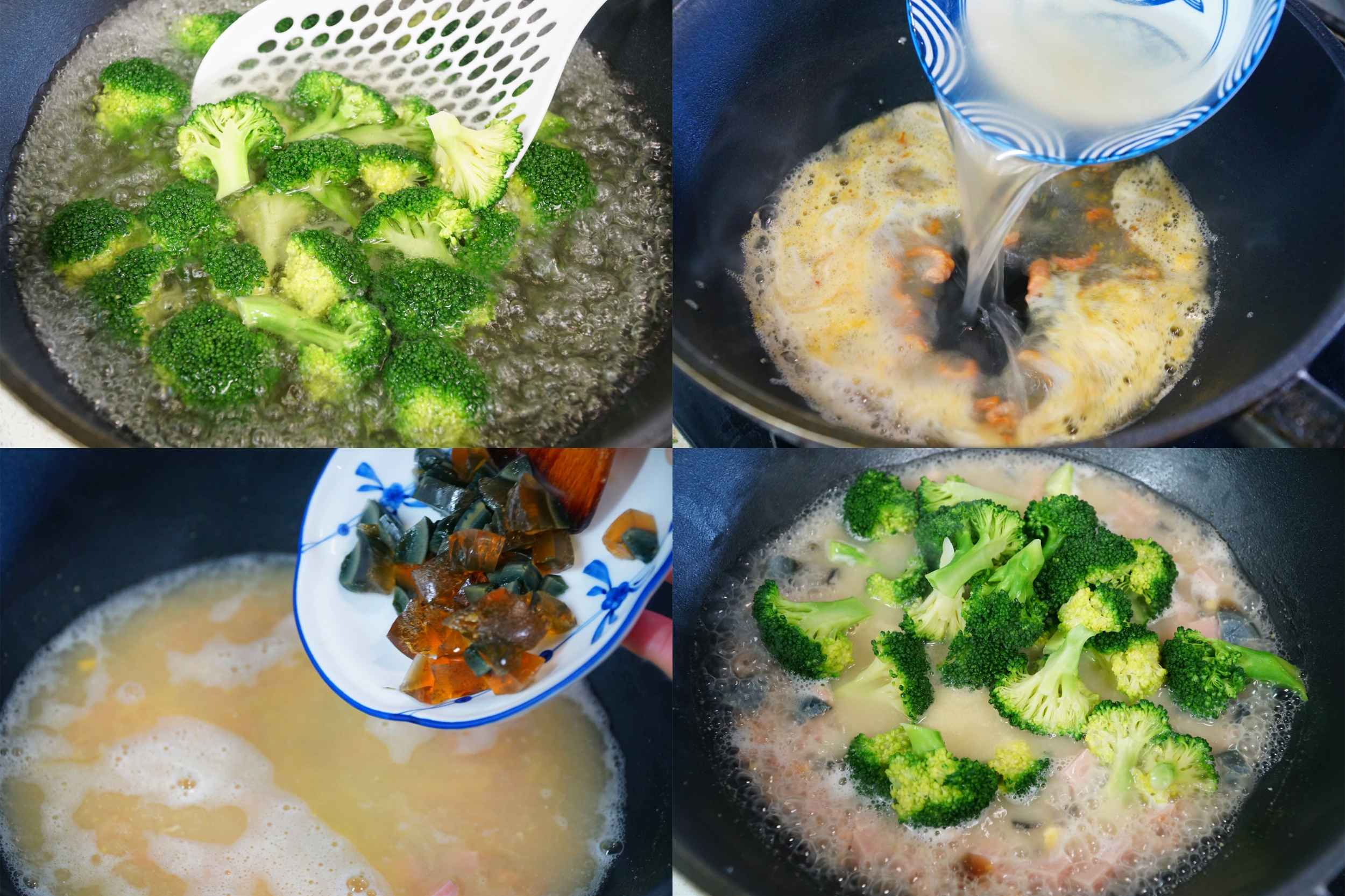 4、加火腿、皮蛋煮浓,下西兰花炖两分钟,加盐调味即可。