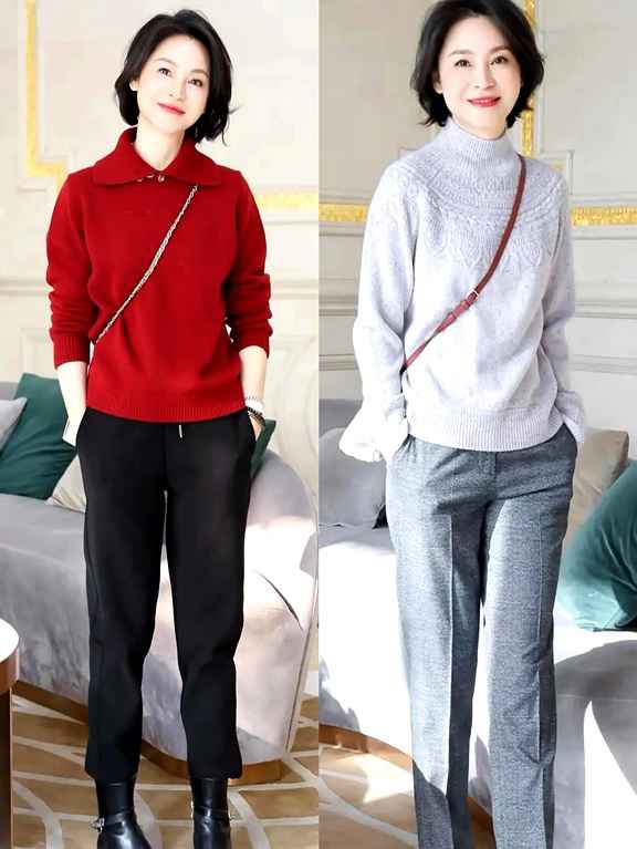 日常休闲穿两件针织套装加乐福鞋,温柔又舒服;商务场合用大衣配高领毛衣,专业又保暖。接送孙辈或家庭聚会,追求舒适自在,穿得有品就行。