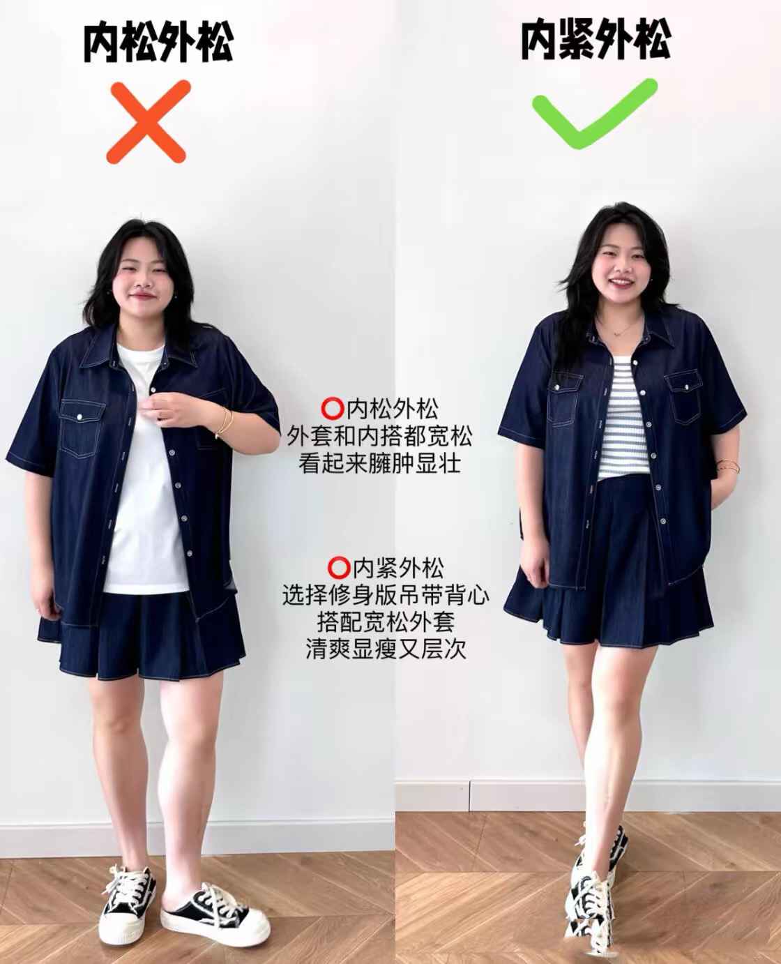 松紧搭配是显瘦的关键。微胖女生可以试试内搭修身、外套宽松的穿法,既显瘦又增添帅气感。中性衬衫配紧身内搭就很合适,如果内外都宽松,容易显得拖沓,反而显胖。
