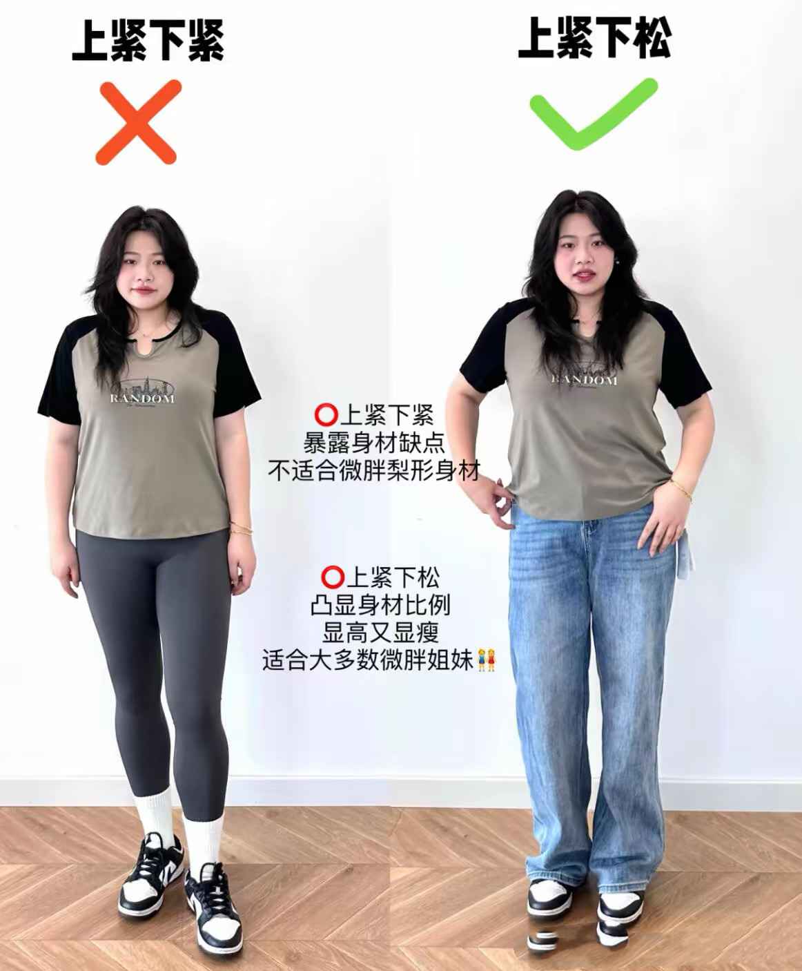 微胖女生避免全身紧绷的穿搭,容易暴露身材缺点。上紧下松的组合能修饰腰胯和大腿线条,解决腿型问题,穿出松弛感,显瘦又高级。