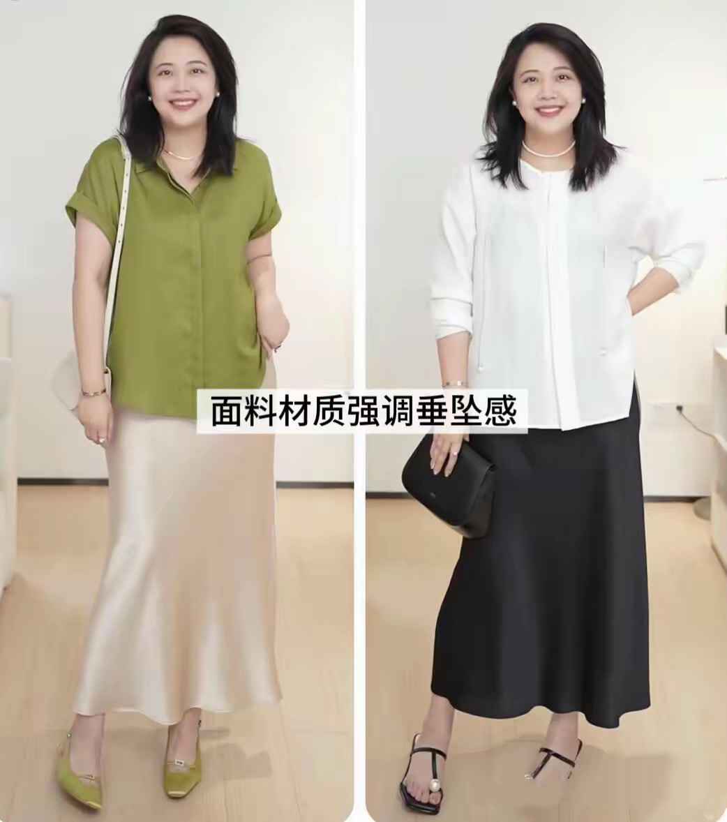 年纪稍大的微胖女生可以选垂顺面料,比如流畅的半身裙,遮肉显瘦,优雅又显贵气。