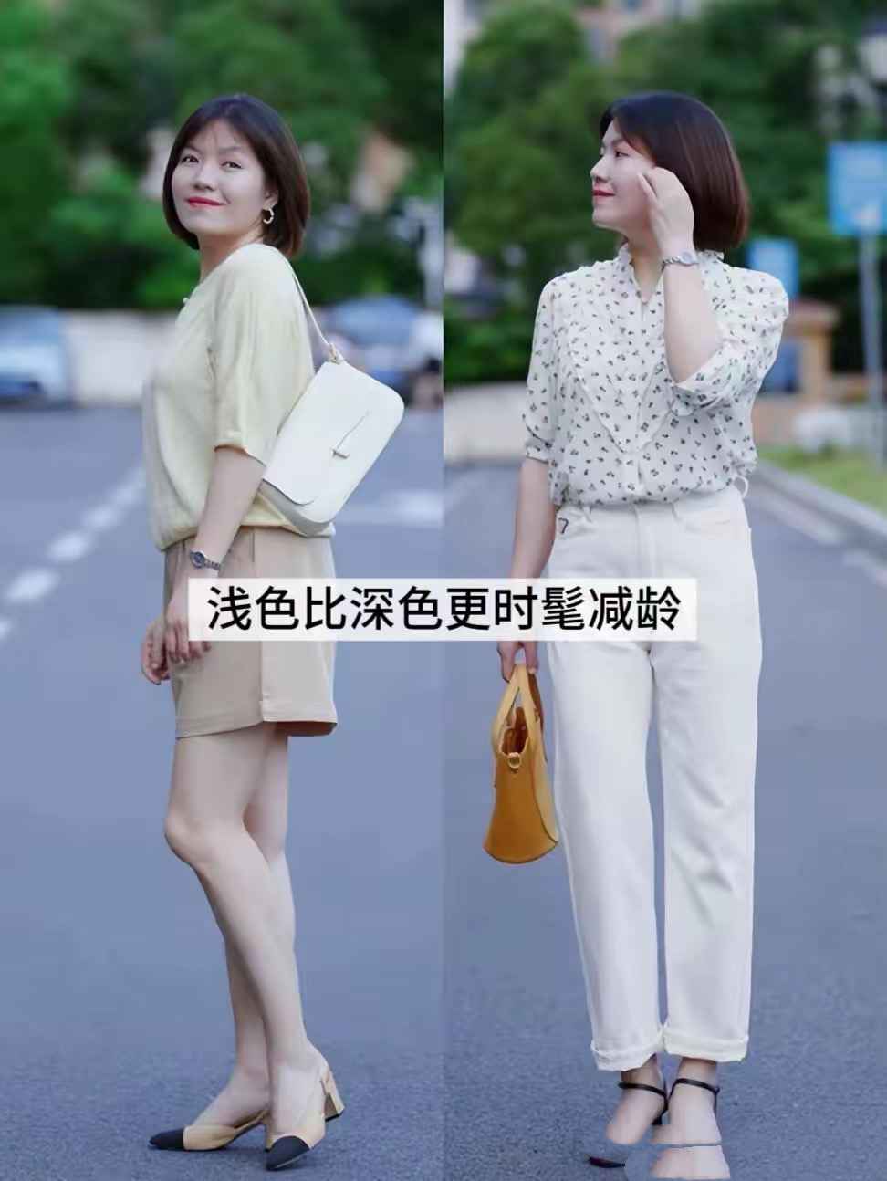 很多微胖女生爱穿深色,觉得显瘦,但容易沉闷。浅色系如衬衫配白裤子,干净减龄,耐看又清爽。