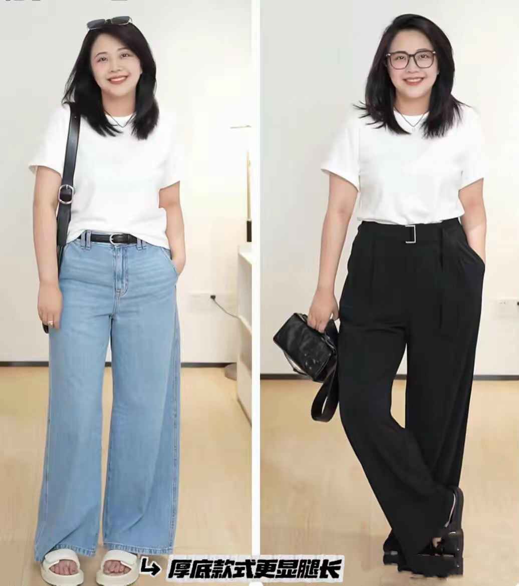 鞋子也很重要!厚底鞋能悄悄增高,显腿长。搭配阔腿裤,让腿部线条更修长。
