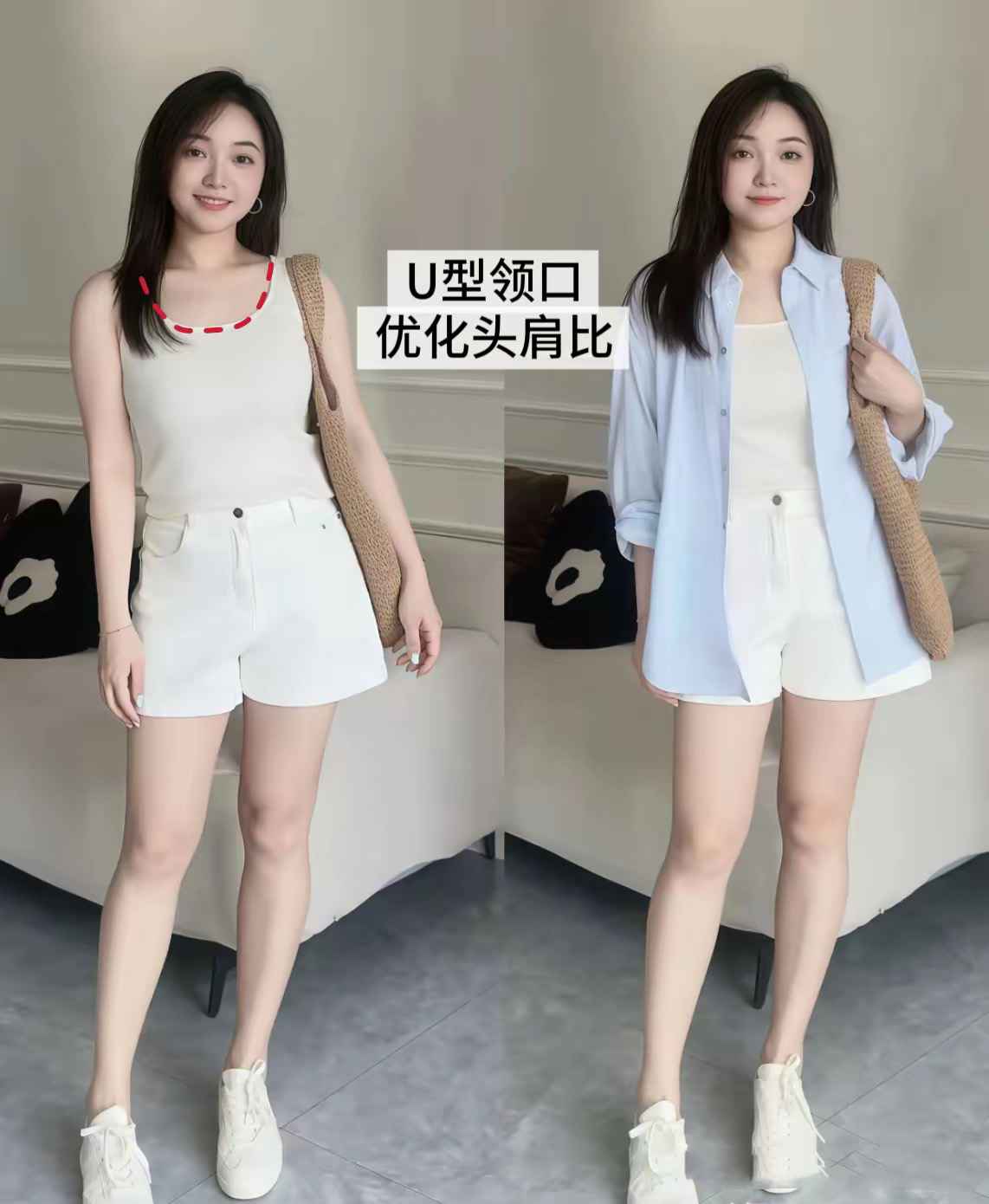 领口较大的背心能拉长颈部线条,优化头肩比,特别适合微胖女生。搭配高腰短裤,一身浅色清爽减龄,配厚底鞋不压个子,更显高挑。