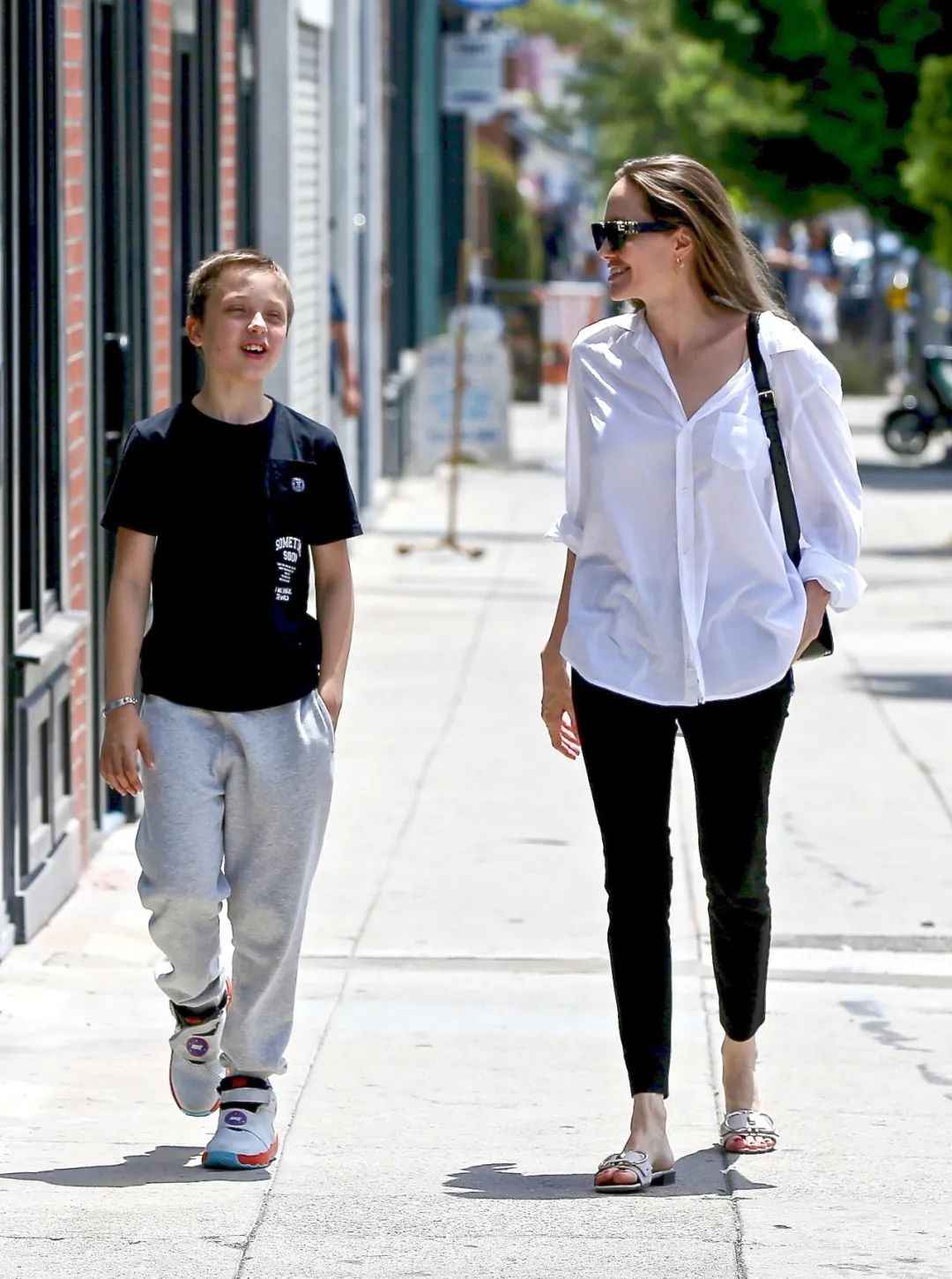朱莉挺爱穿拖鞋,而且一直是最简单的宽面款,颜色以黑白裸色为主,平底或低跟,兼顾简洁+好走两大需求。