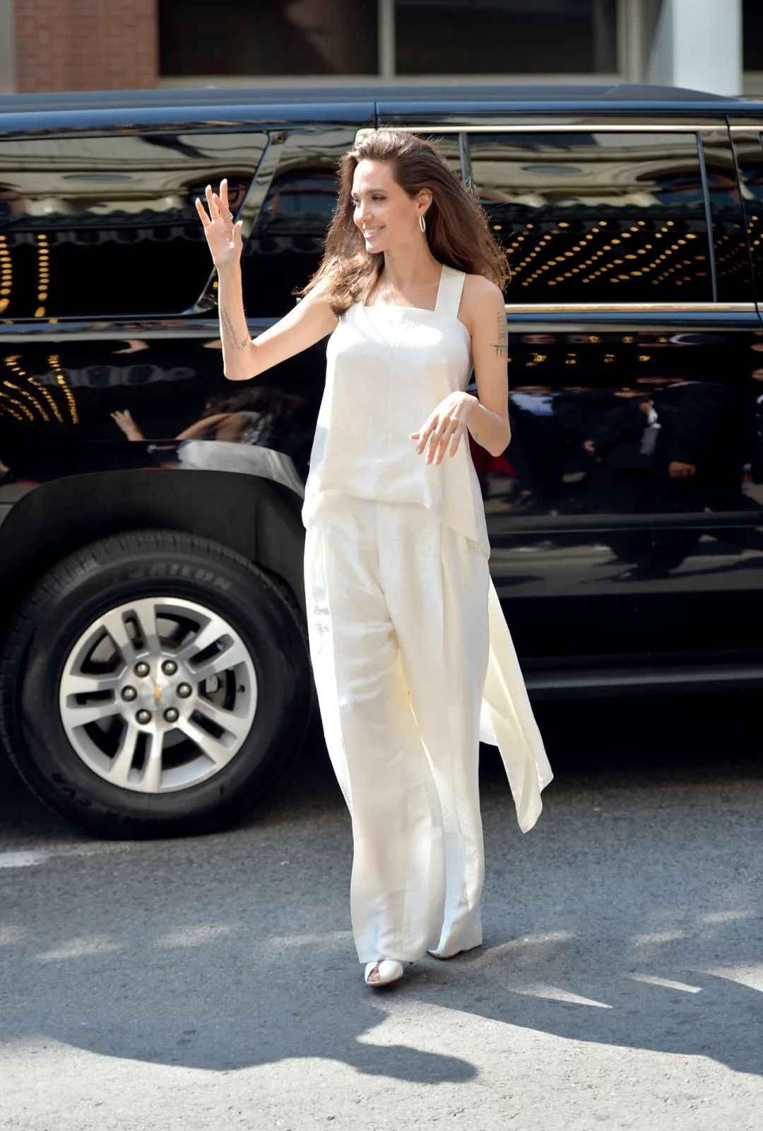 朱莉这两年穿背心频率虽不高,但这件单品她至少穿了十年,值得单独说说。