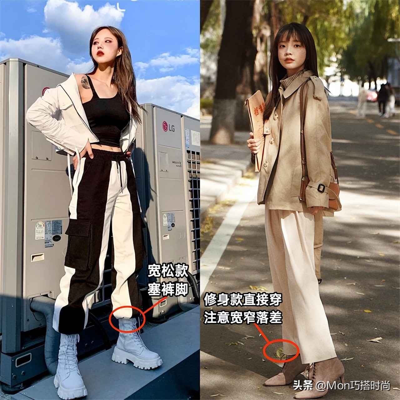 高帮靴和裤子组合,玩法超多!钝感强的圆头、宽松款高帮靴,配卫裤或阔腿裤,把裤脚塞进靴子更帅。