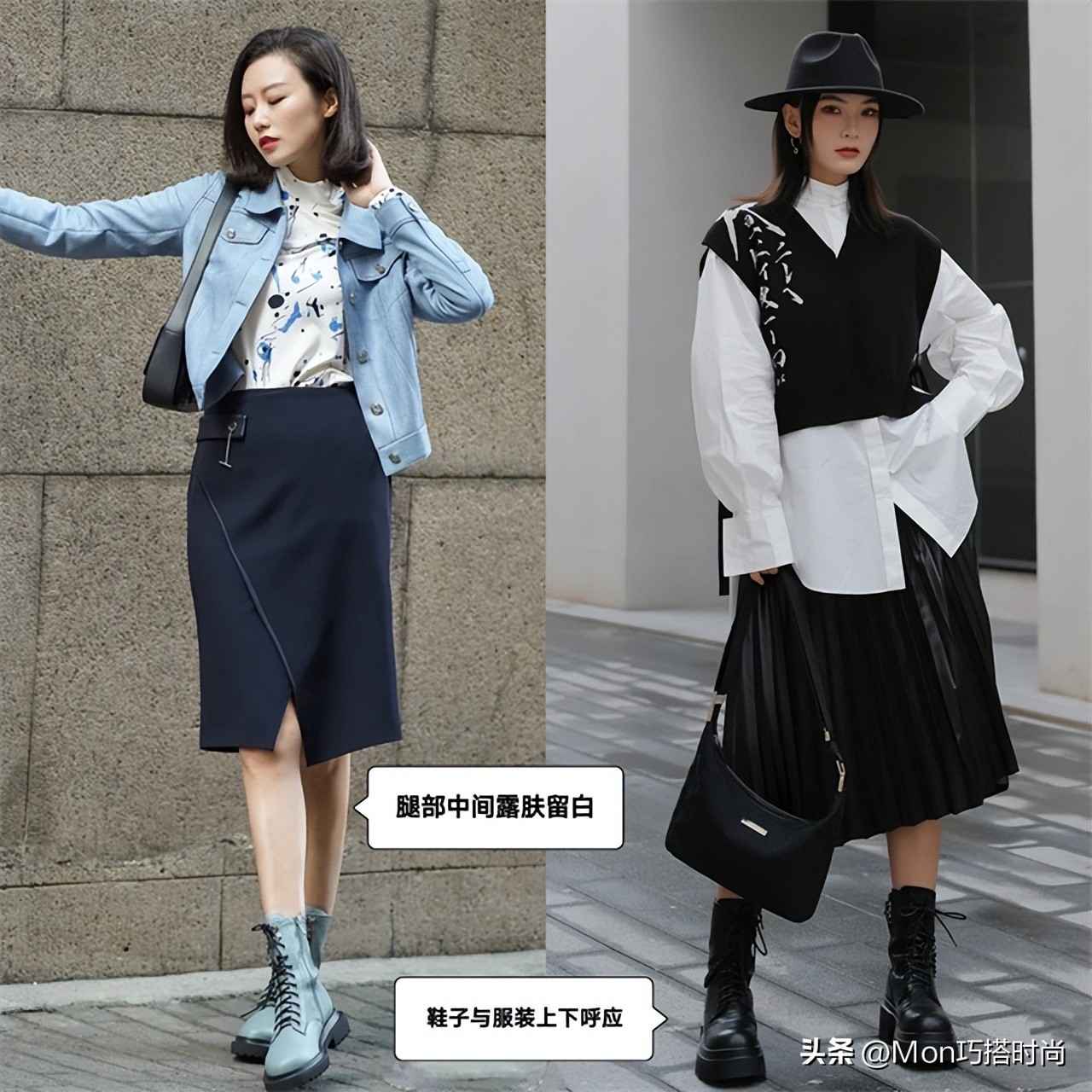 更高级的是让靴子和裙子或上衣颜色呼应,只用这两招,秋冬穿裙难题轻松解决!