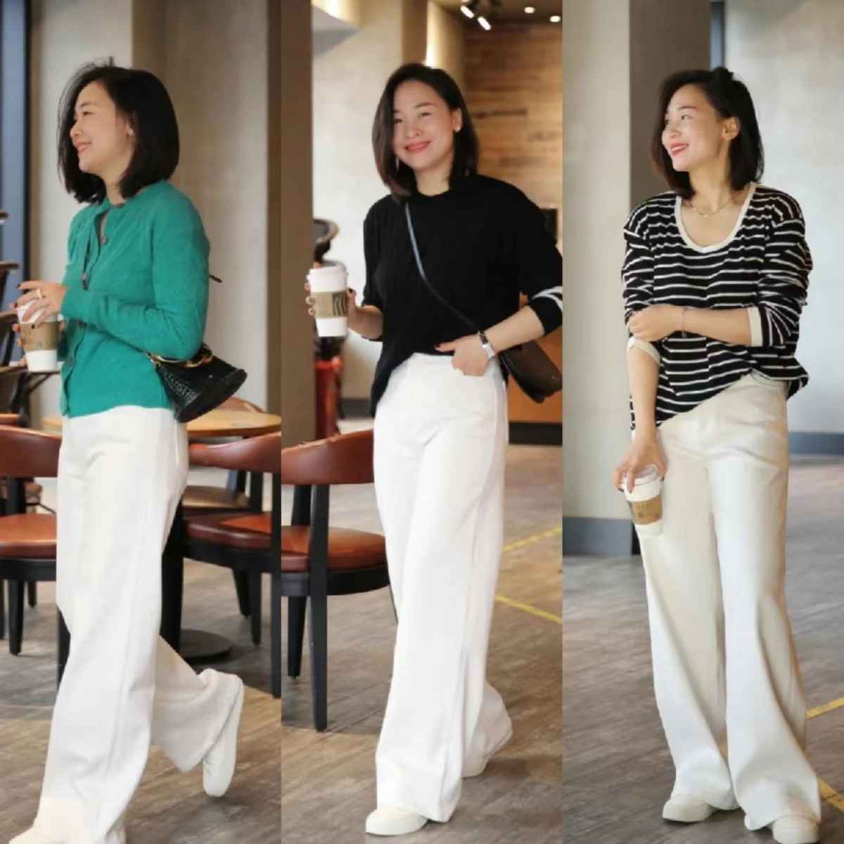 白色阔腿裤非常百搭,配各种颜色的春衫都好看,还能轻松打造三七分比例,显高显瘦。