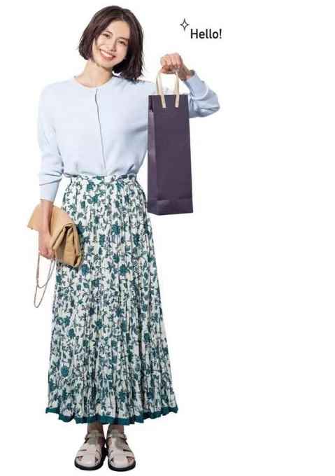 选浅蓝针织开衫,是为了和印花半裙色调呼应。上下颜色一致,深浅有致,穿出高级感。