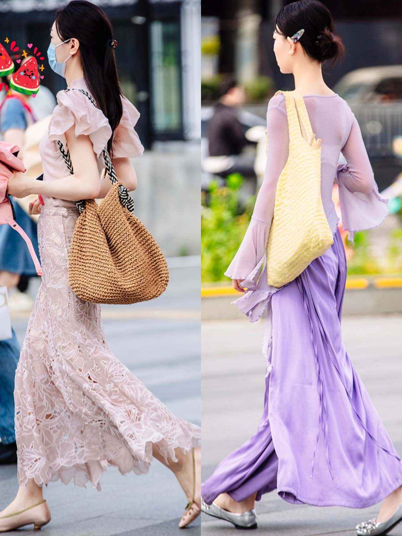 浅色帆布包配长裙,青春感扑面而来;大号托特包实用能装,出门带伞带水都不怕,时髦与功能兼具。