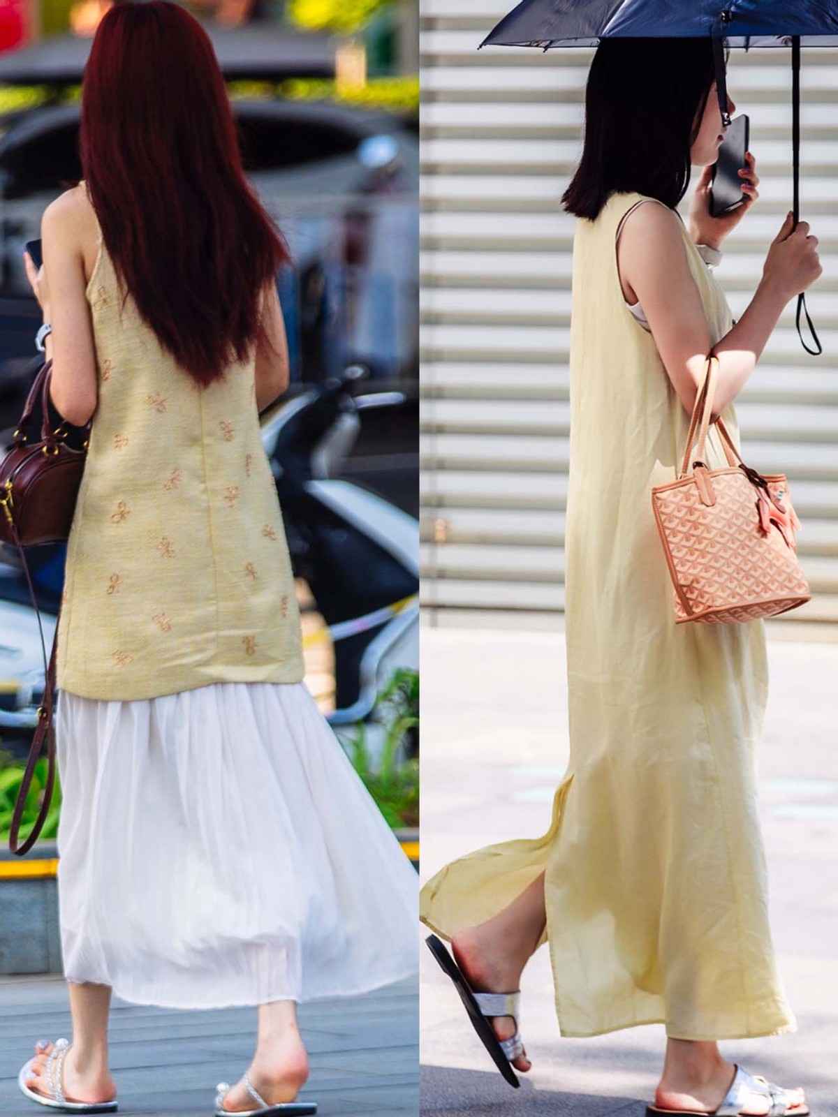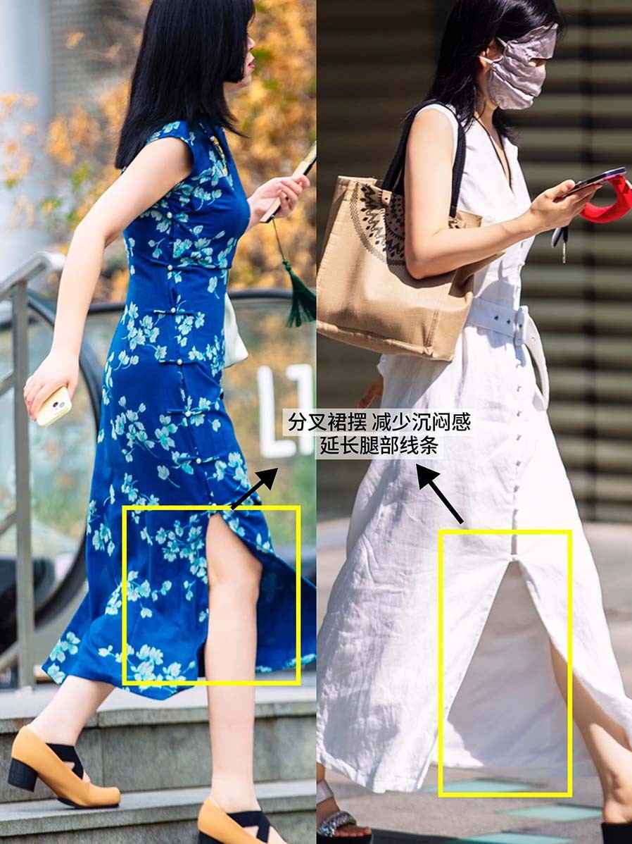 小个子女生选高开叉,高个子选低开叉。搭配凉鞋露出脚踝,整体线条流畅,显高效果肉眼可见。