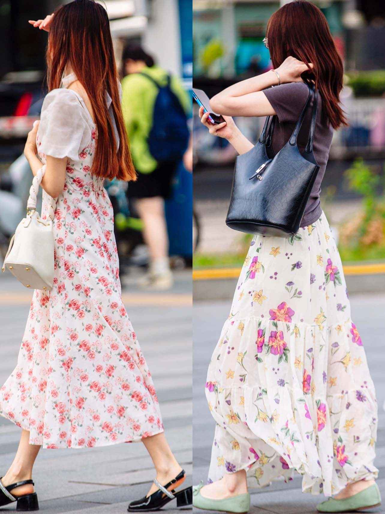 觉得纯色太单调?可以试试小碎花、波点或者条纹款。浅底色的印花长裙搭配帆布鞋,立马穿出韩系少女感,减龄又时髦。
