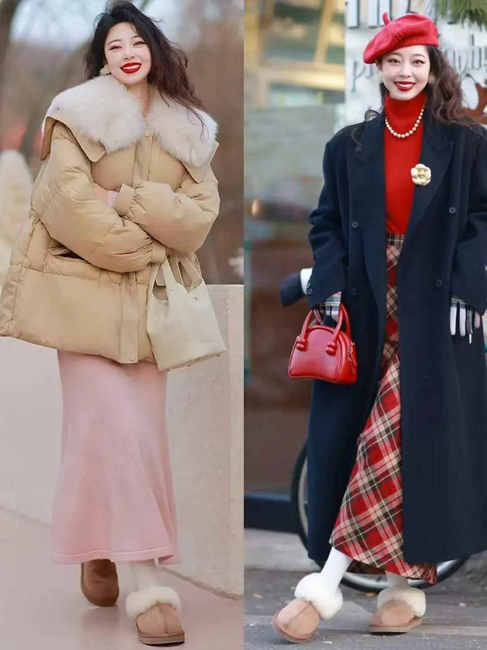 上班族必备!米色收腰羽绒服内搭针织裙,配毛毛鞋,保暖又不失女人味。裙子长度到小腿中间,露出脚踝最细部分,显瘦又大方。如果冷,加条保暖袜,零下天气也能美美出门!
