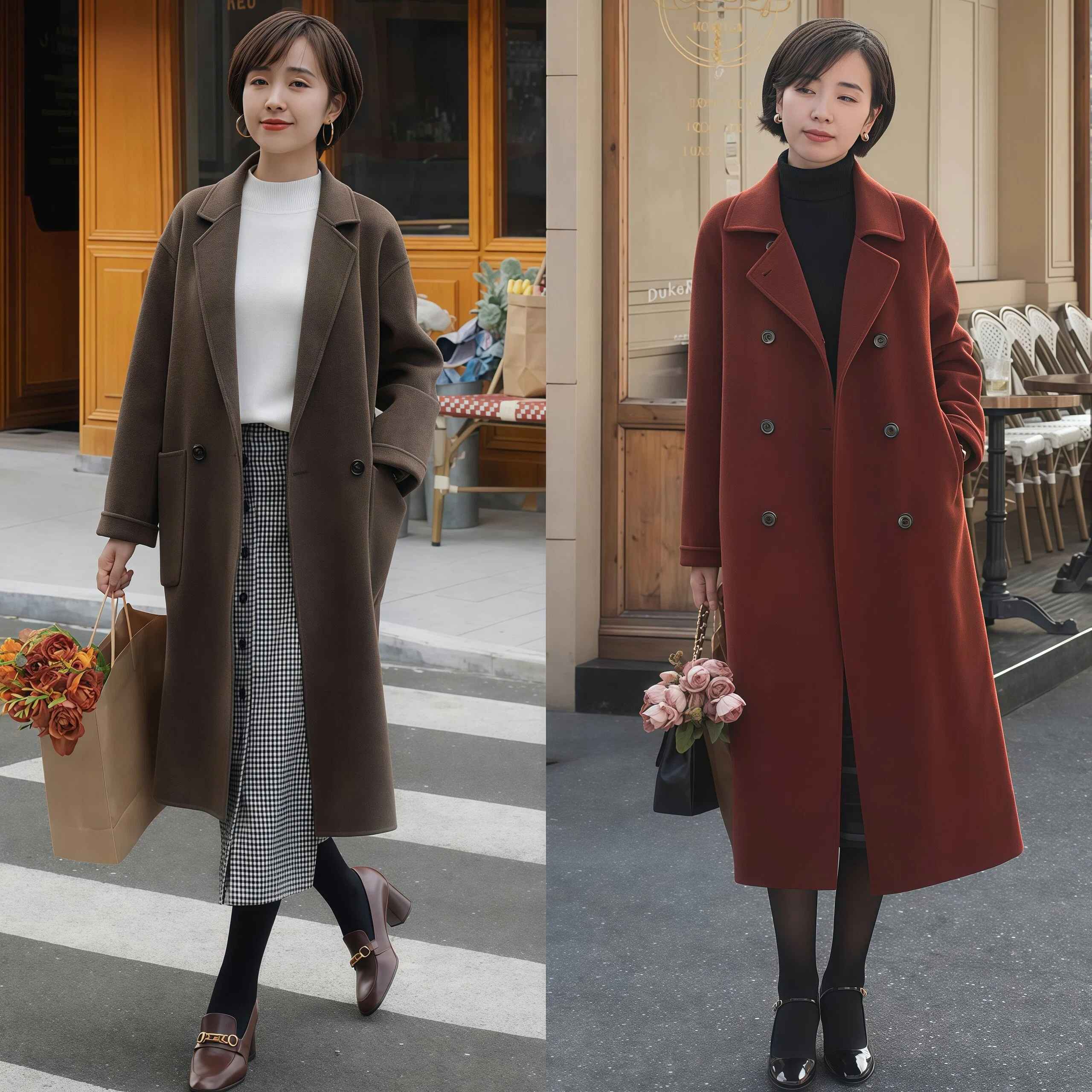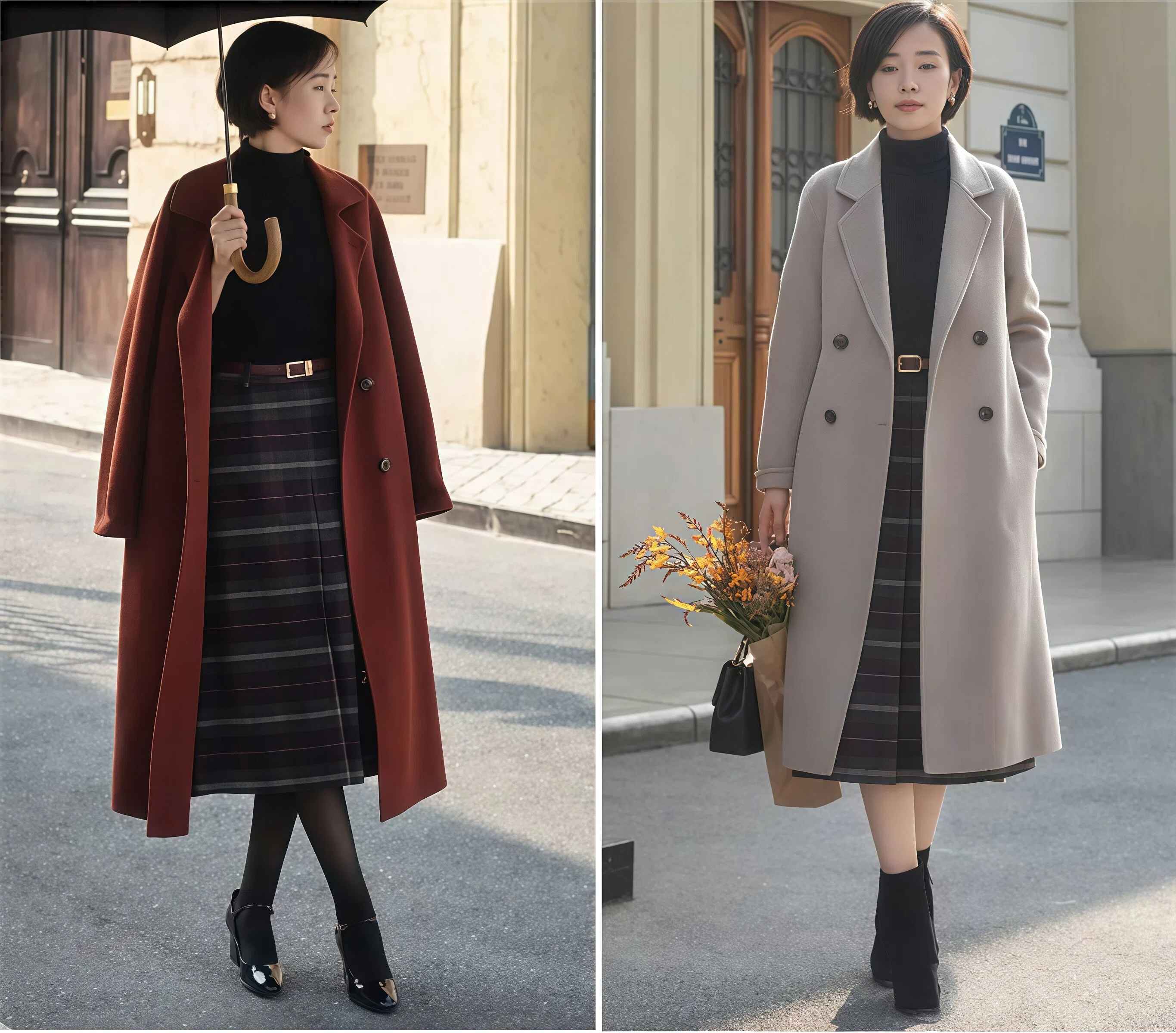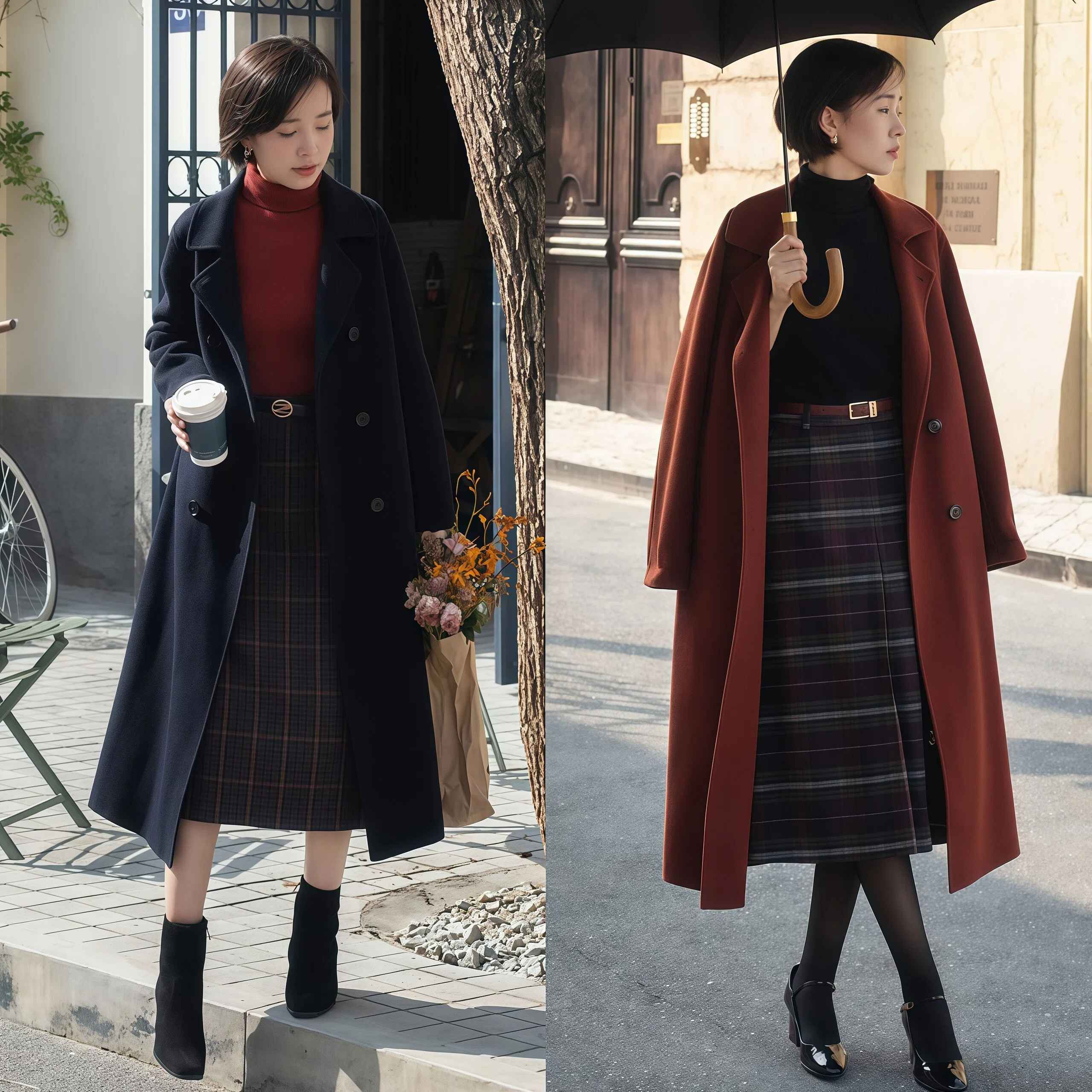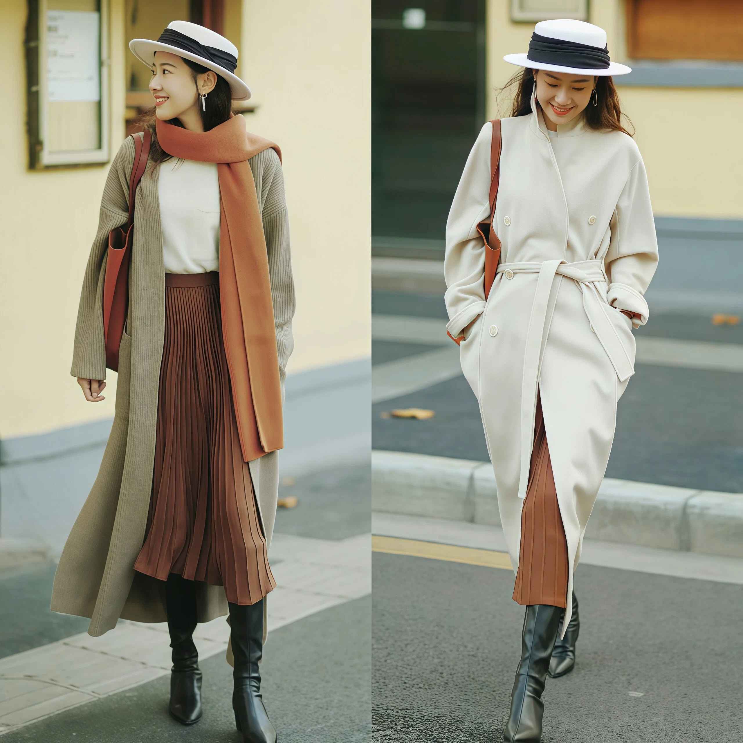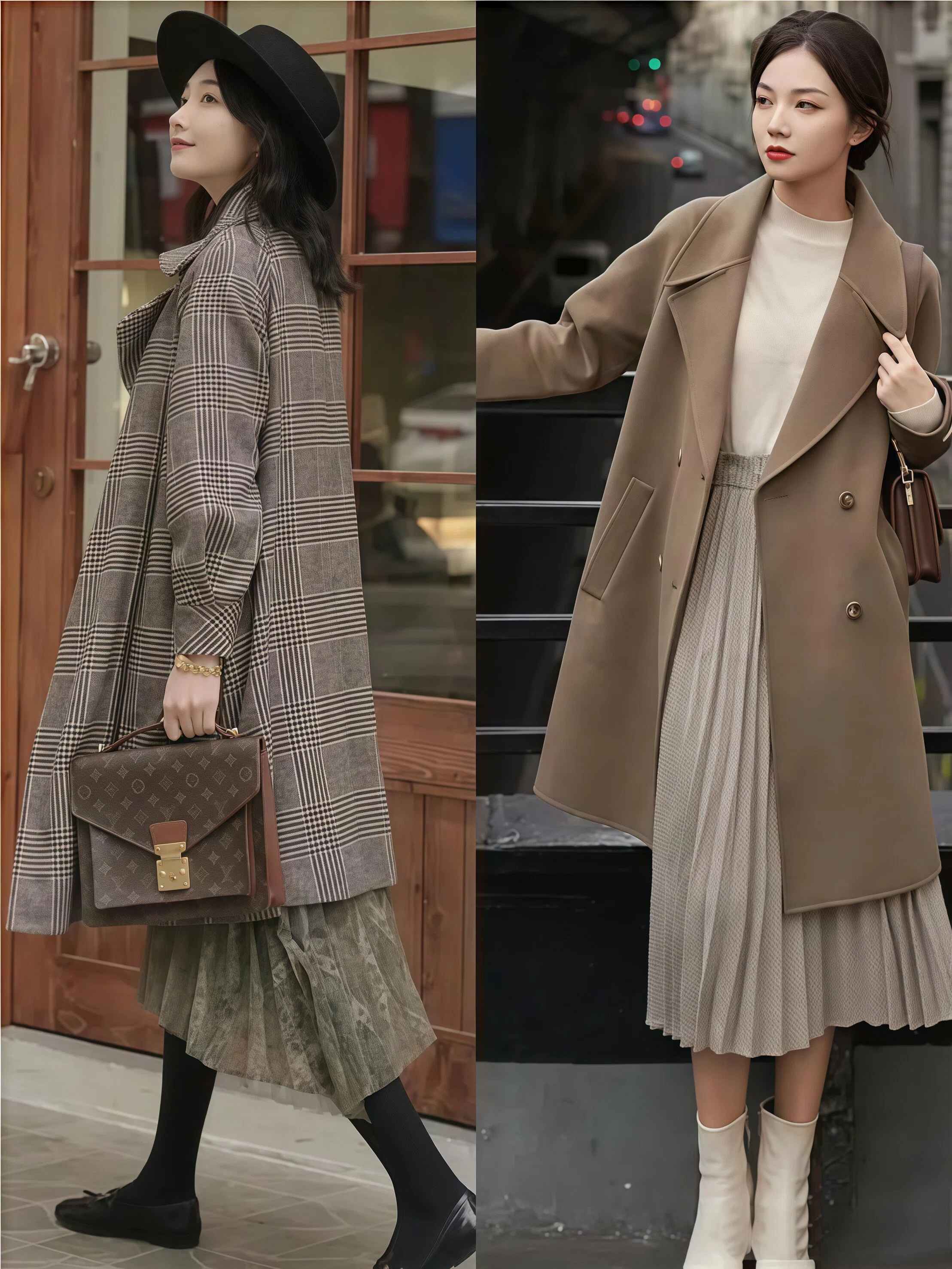 对于胯宽、大腿有肉的梨形身材来说,找一条合适的裤子不容易,但大衣+半身裙就能完美解决。长款大衣能修饰胯部线条,搭配有垂感的半身裙,瞬间藏住小缺点。走路时裙摆飘动,还能模糊下半身轮廓,让整个人看起来更修长优雅。