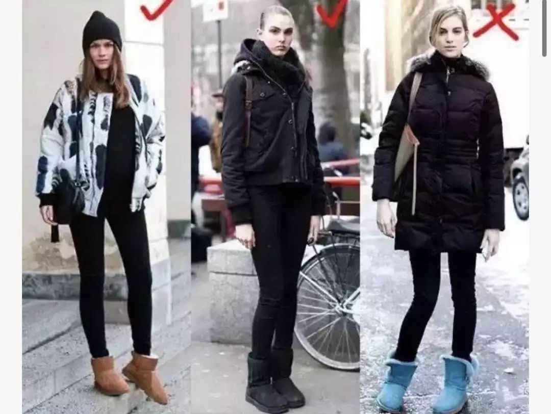UGG给人的感觉是宽松臃肿的,最保险、最显身材的穿法就是搭配紧身裤子,比如小脚裤或打底裤。这样能和UGG的宽松形成对比,突出细腿,让人感觉你还是瘦的。普通人如果穿宽松运动裤或阔腿裤,很容易显胖,所以紧身款是稳妥选择。
