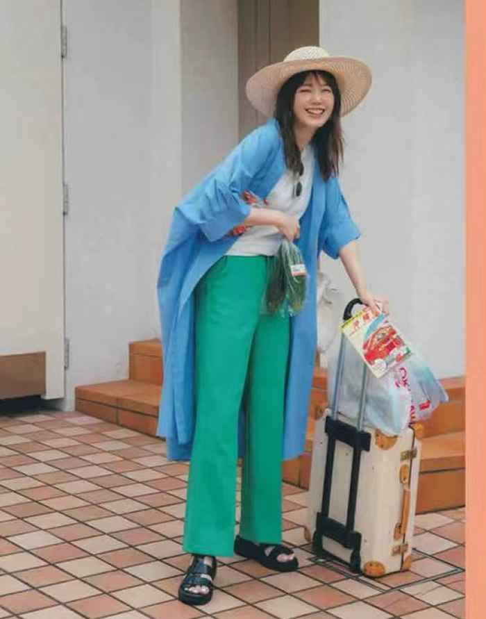 同一条蓝衬衫裙,换条绿裤子,蓝绿配的独特魅力,又为叠穿增添一份惊喜。色调纯正,蓝绿相映,满满的夏日气息。