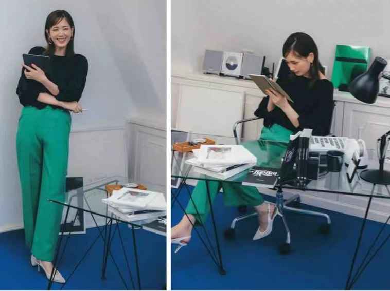 黑上衣配绿裤,用黑色的沉稳提升绿裤的正式感。变身职场时髦精,就要在基础和时尚、经典和个性之间找到平衡。