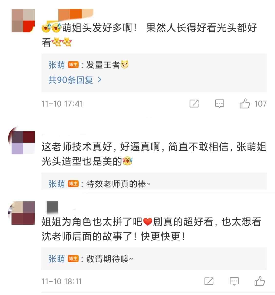 网友们看到张萌的光头造型后,纷纷夸她什么发型都hold住,张萌却幽默回应说自己是“发量王者”。还有人称赞她为角色付出太多,她谦虚地表示发型师更辛苦。