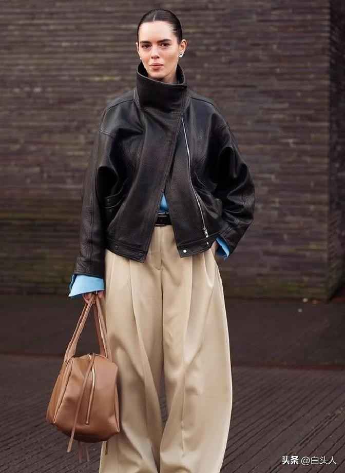 - 通勤:深咖皮夹克+蓝牛仔弯刀裤+黑尖头鞋。上身硬朗平衡下身松弛,整体干练。天冷加件薄高领在内,露点领边更层次。