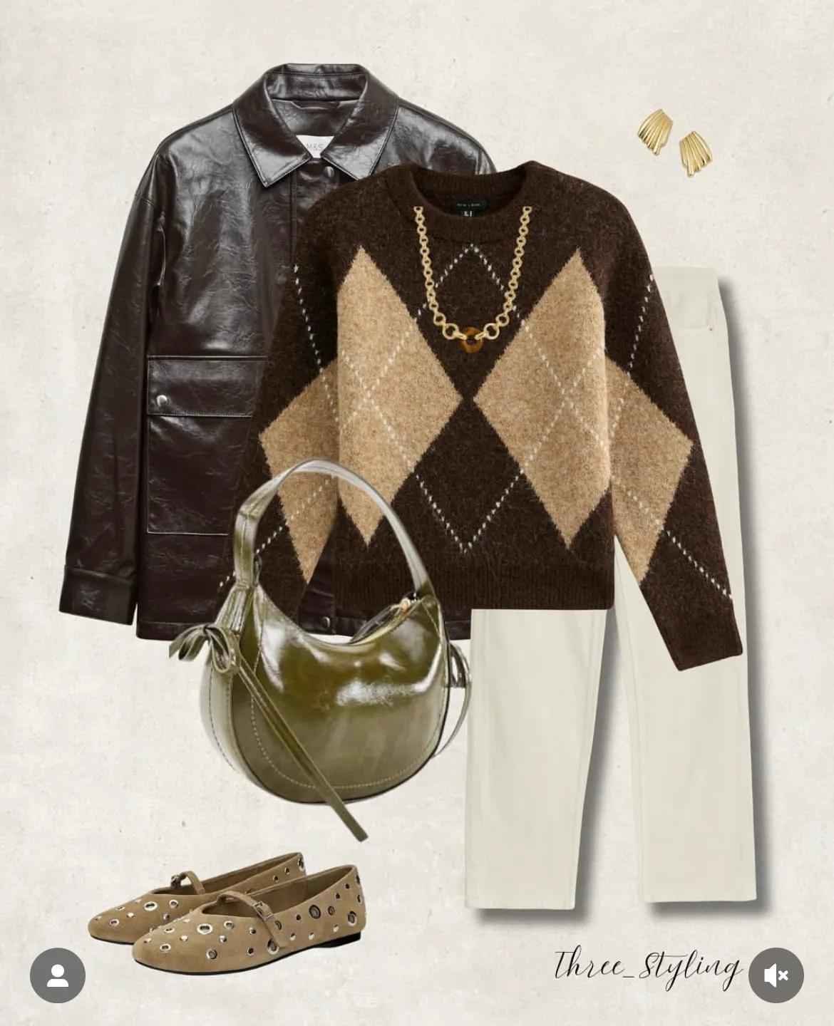 焦糖色系穿搭永远不出错!深咖短款皮衣复古有型,菱格纹毛衣增添趣味,白裤子平衡整体色调,牛油果绿手拎包瞬间点亮造型。