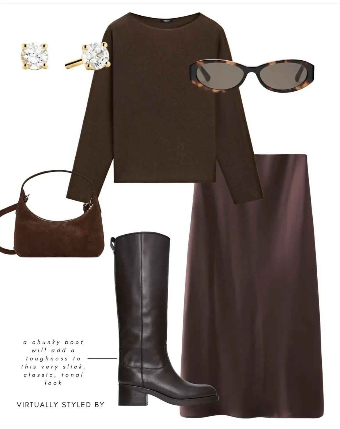 深巧克力色的单品自带高级滤镜,厚实毛衣能穿出软糯质感,丝绸半裙则垂顺飘逸,一套搭配完美诠释轻熟魅力。