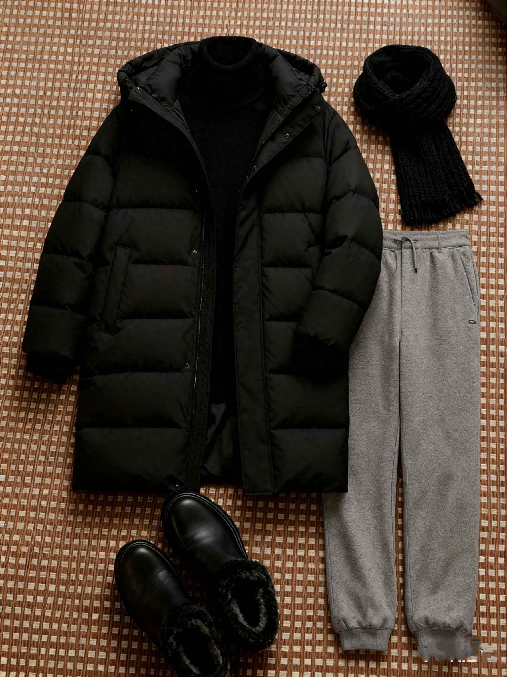 这套绝对是秋冬通勤的万能选择:哑光黑羽绒服显得稳重有气场,浅灰围巾能打破全黑的单调,中灰卫裤的柔软质感减轻了羽绒服的厚重感,深棕皮鞋的暖色调让整体看起来不那么冷硬。全身没有花哨颜色,适合需要低调干练的职场男士。