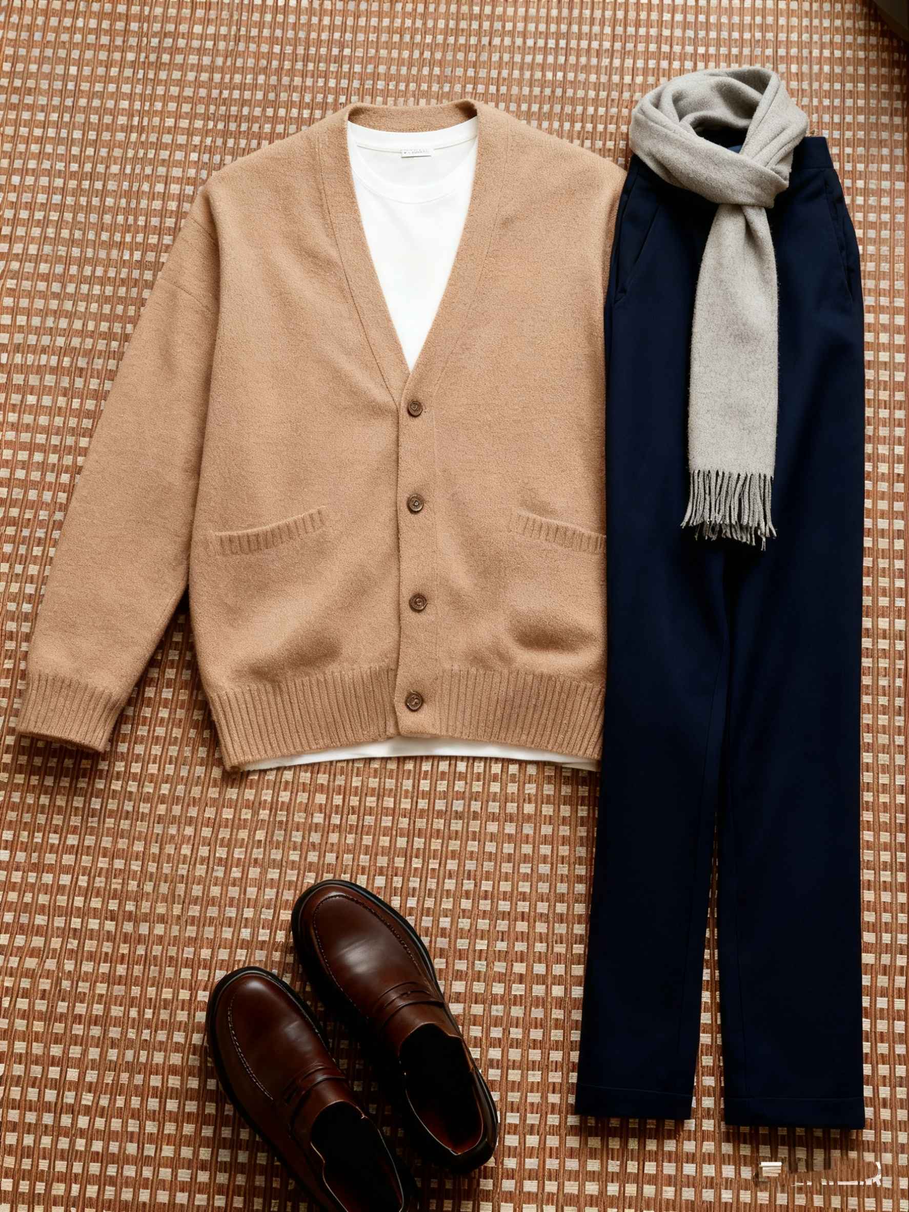 暖调的浅驼色是秋冬的氛围感利器:开衫毛衣软糯舒适,搭配米白内搭,就像捧着一杯热奶茶般温暖;藏青西裤的冷色平衡了整体的甜腻感,浅灰围巾的细格纹增加细节,深棕乐福鞋则让休闲中带点精致,适合约会或咖啡馆小聚。