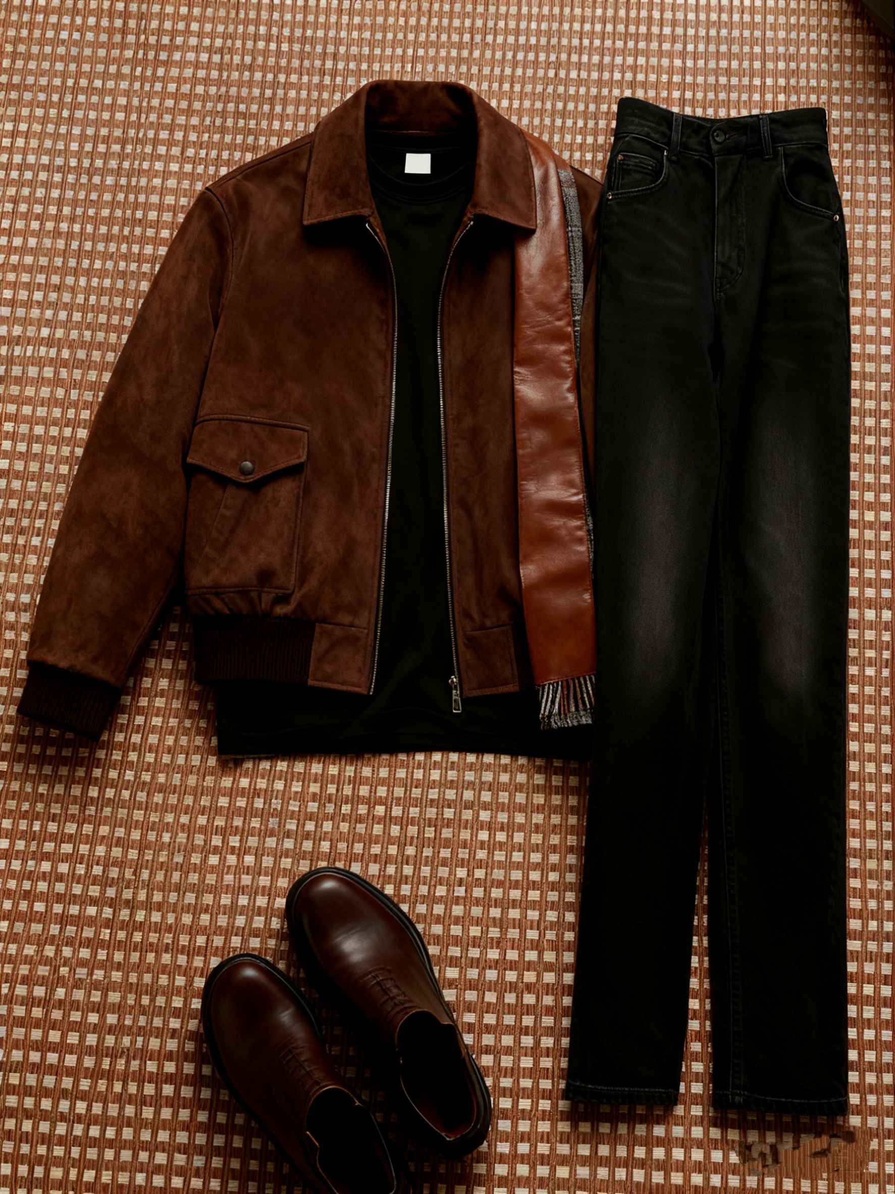 麂皮材质自带复古味:焦糖棕夹克的暖调,搭配全黑内搭和牛仔裤,形成“一暖一冷”的平衡;棕灰格纹围巾呼应夹克色系,深棕皮鞋强化复古感,这套穿搭自带美式街头痞帅气质,适合酒吧或休闲出街。