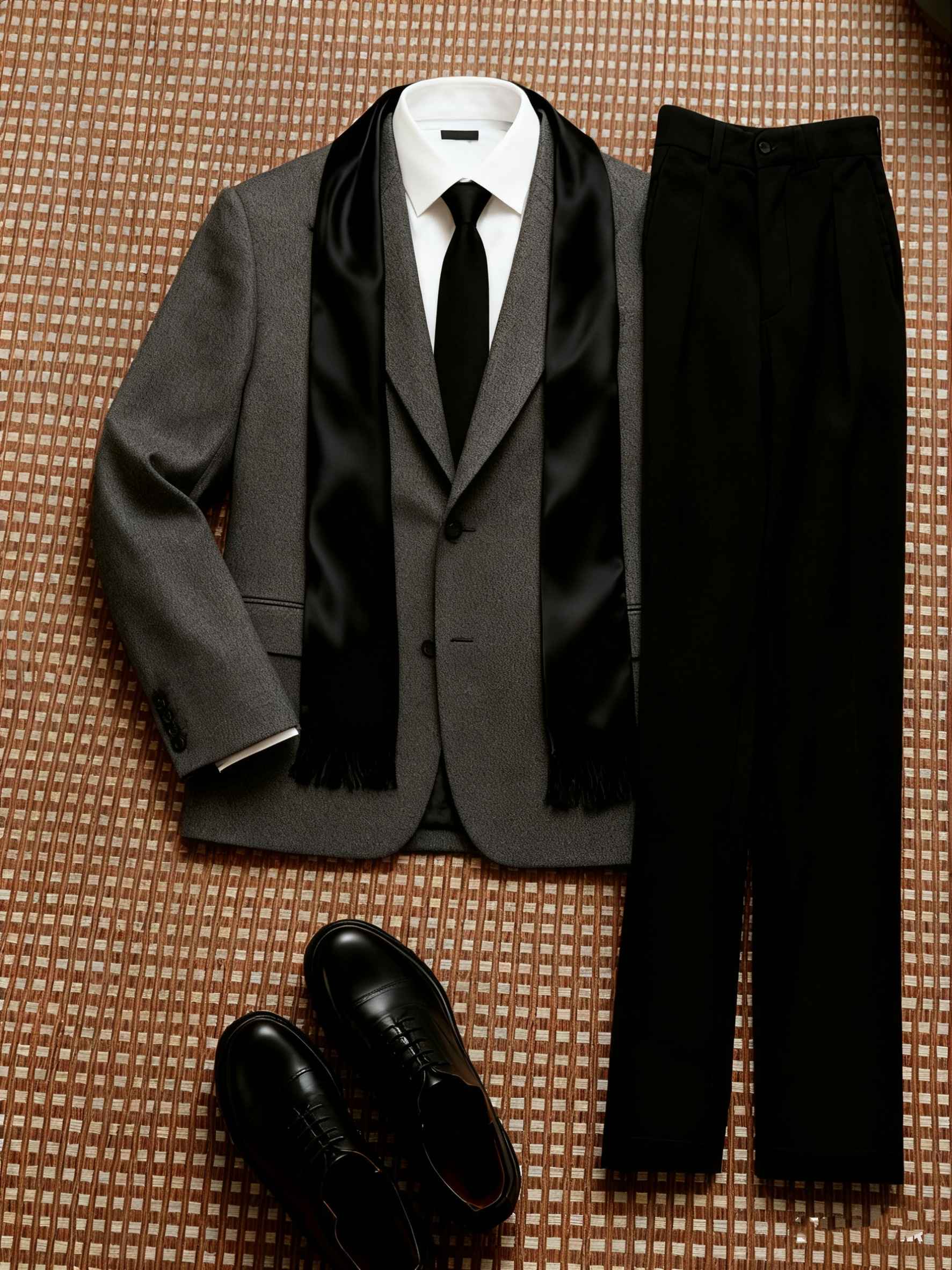 想摆脱商务装的刻板印象?试试材质撞色:炭灰毛呢西装的哑光质感,搭配黑缎面围巾的光泽,既有对比又不夸张;白衬衫作为过渡色,亮黑皮鞋收尾,整套配色克制却充满细节,适合商务洽谈或半正式聚会。