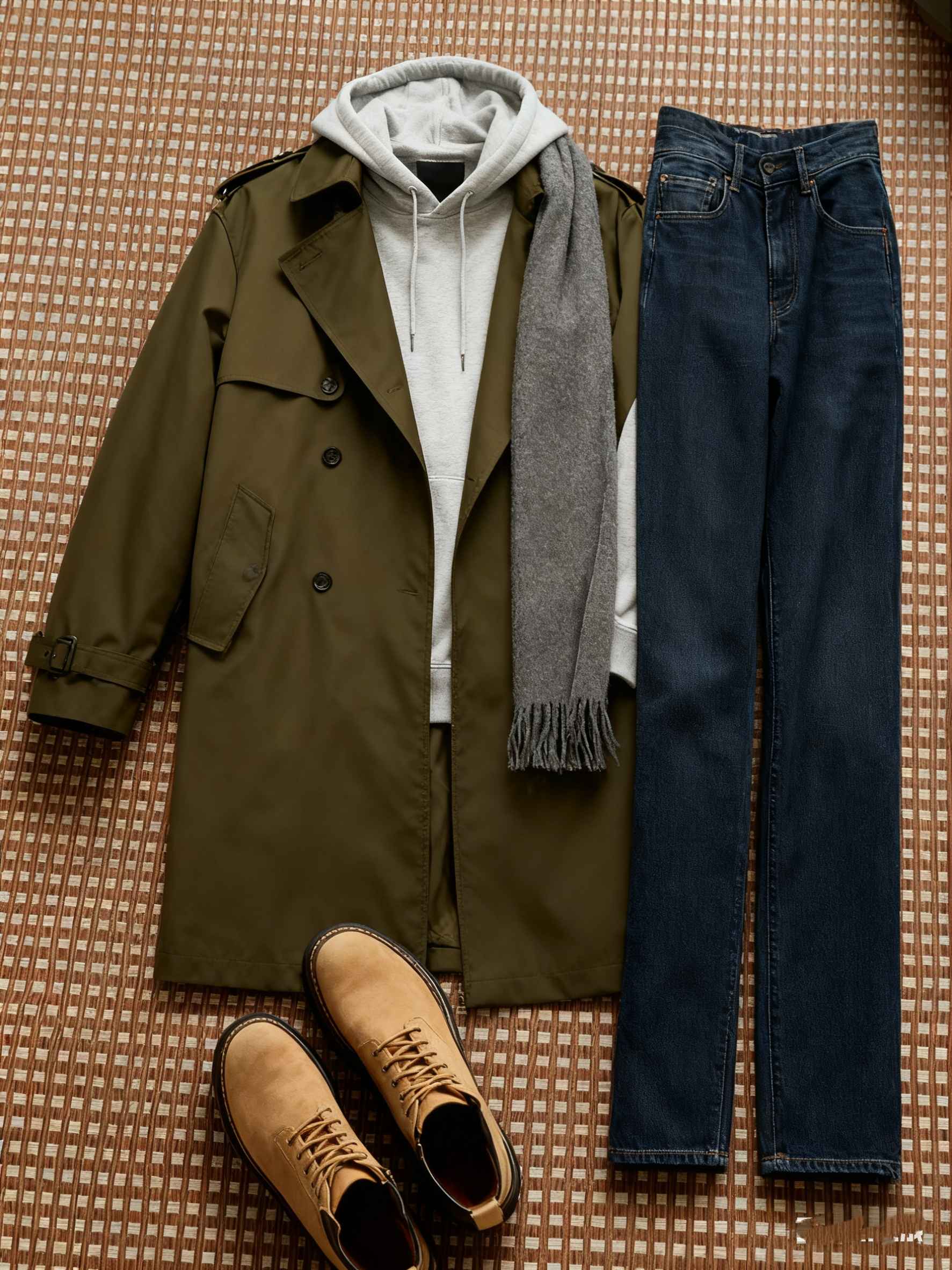 风衣叠穿卫衣是平衡硬朗与休闲的关键:军绿风衣的户外感,搭配浅灰卫衣的舒适;深牛仔蓝的复古味中和军绿的厚重,浅灰围巾衔接内搭,卡其工装靴强化实用属性,适合露营或城市漫步。