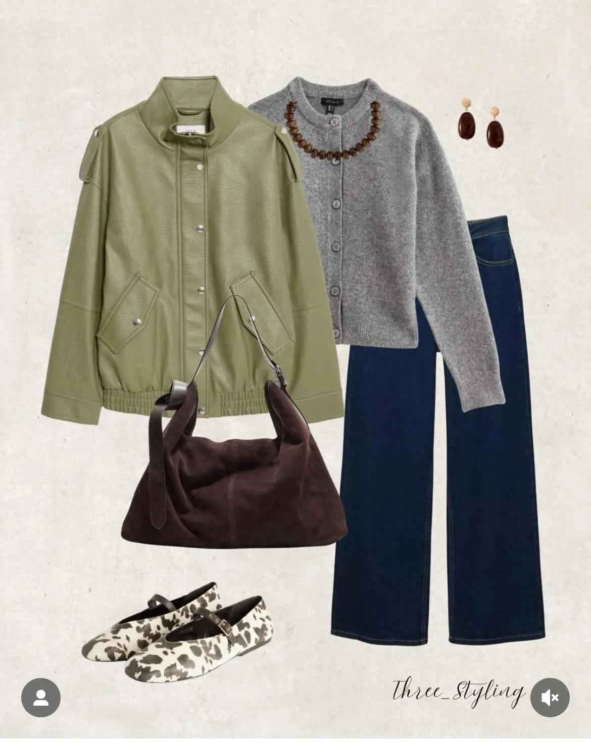 焦糖色系穿搭永远不出错!深咖短款皮衣复古有型,菱格纹毛衣增添趣味,白裤子平衡整体色调,牛油果绿手拎包瞬间点亮造型。