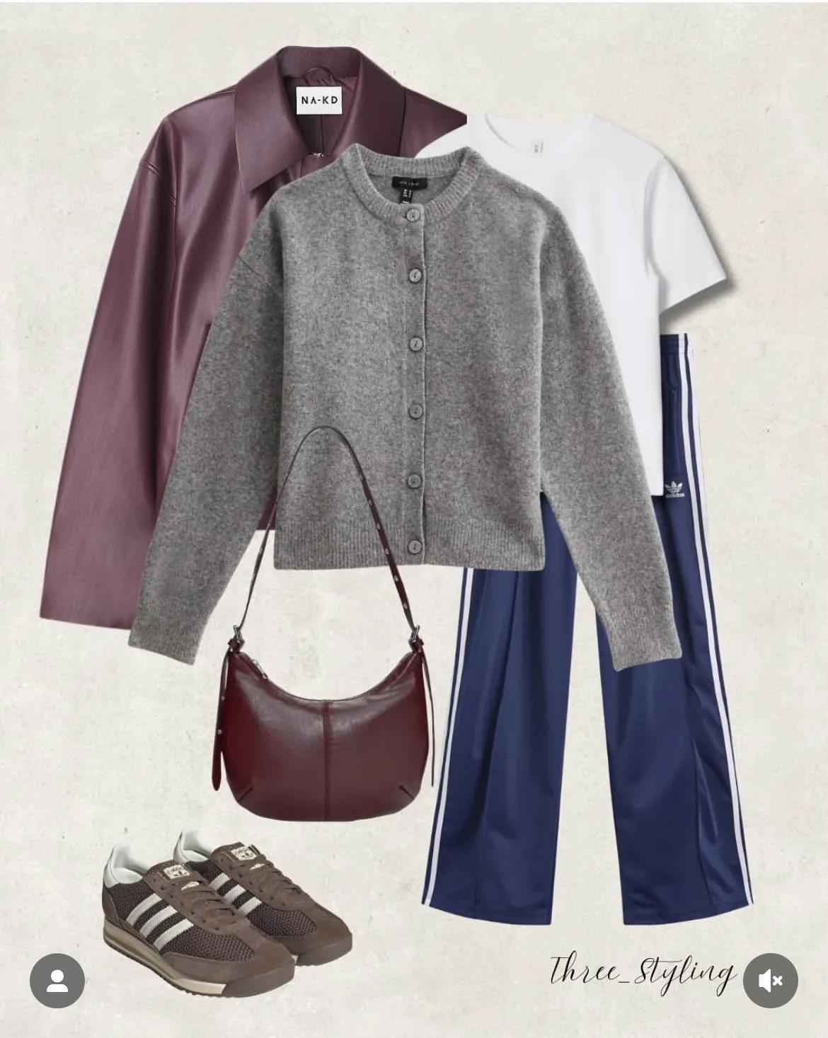 同样是灰色开衫配白T恤,试试用茄紫色修身外套提气色,再搭配一条宝石蓝运动裤,轻松穿出慵懒又时髦的休闲范儿。