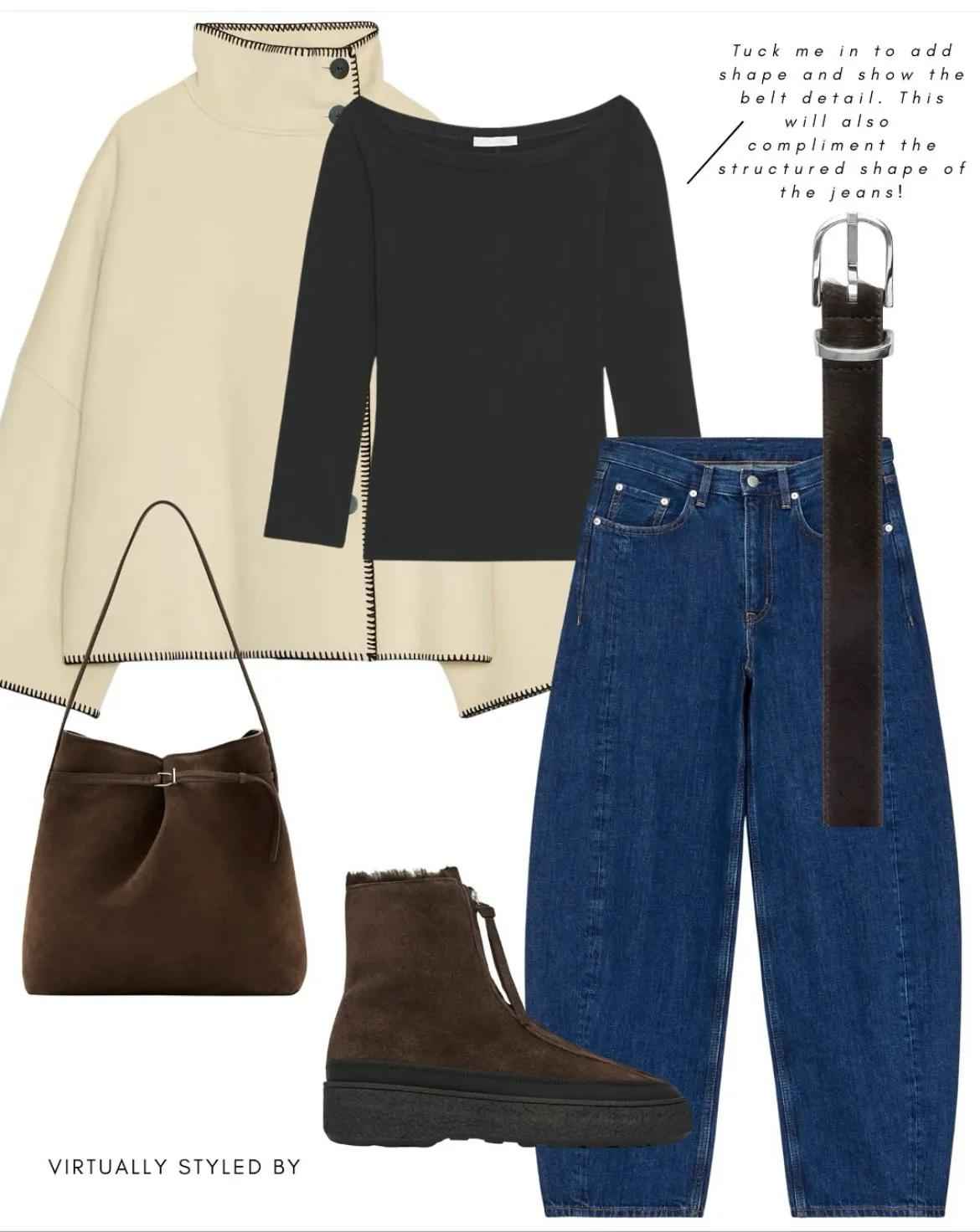 春秋必备的薄呢外套不一定非要选中规中矩的款式,弧形下摆设计搭配米白色系,内搭半高领打底衫就能营造层次感,简约中透着高级温柔。