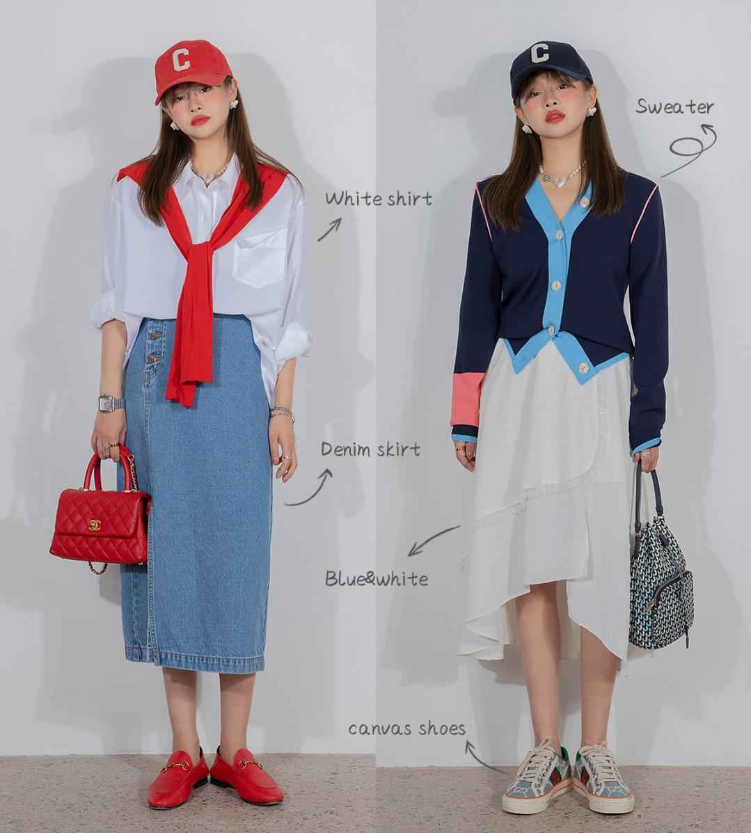 蓝色沉稳百搭,配白色清爽,配黑色经典,配橙色时尚。多种组合都能打造好看造型。