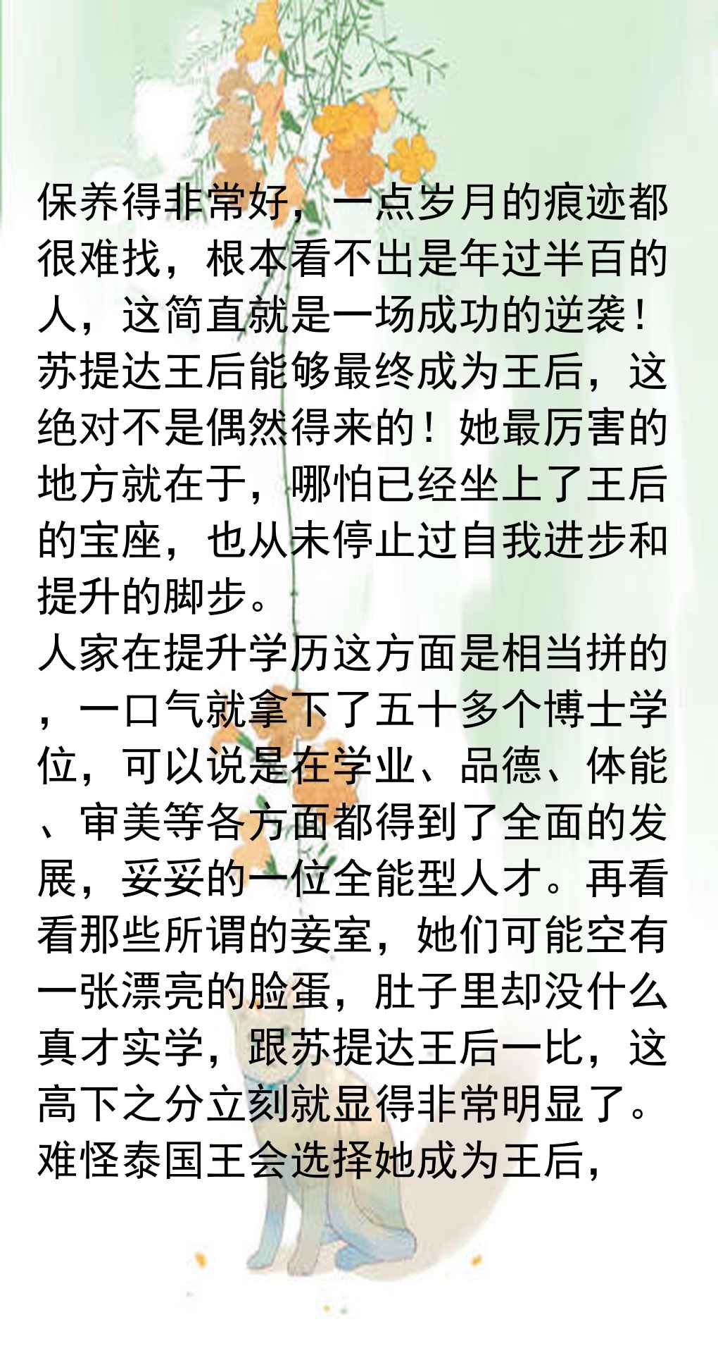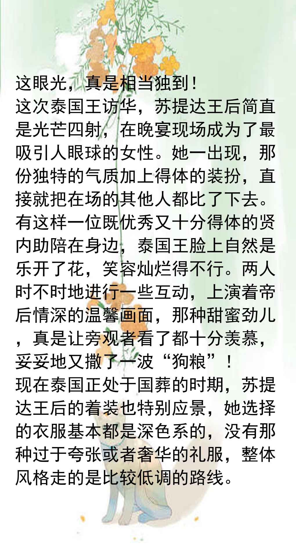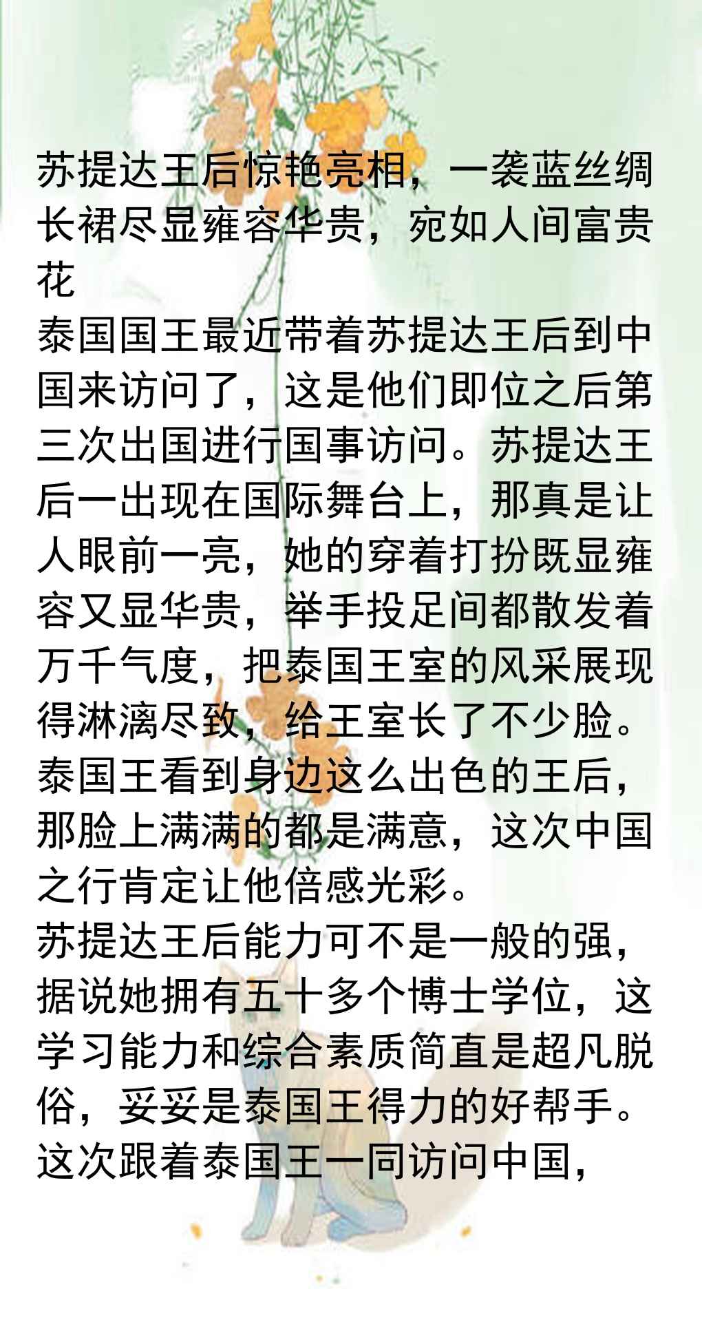 最近泰国王后苏提达跟着泰王一起来中国访问,媒体对她的报道简直太给力了,把她的形象塑造得特别正面。文章里重点夸了她的穿衣打扮,说她穿的那件蓝色丝绸礼服既大气又端庄,活脱脱像一朵“人间富贵花”,一亮相就惊艳了全场,给泰国王室挣足了面子。泰王看起来也特别满意,脸上都笑开了花,这效果没得说。另外,文章还强调了苏提达的个人能力,说她拿了五十多个博士学位,是个实打实的全能型人才,妥妥的得力助手。这跟那些光有漂亮脸蛋却没真本事的女性一比,更显得苏提达能当上王后不是偶然,而是泰王眼光独到。从成长历程看,苏提达刚进宫时还有点青涩拘谨,穿衣也不出彩,但现在完全变了样,端庄典雅,美得清新脱俗,连脸部都显得自然抗老,这说明她对王后工作已经熟门熟路了。泰国王室内部关系复杂,女眷多绯闻也多,但一到重要场合,只有苏提达能稳稳撑场,其他妾室根本比不了,在她雍容华贵的气质面前瞬间黯然失色。这次中国之行,苏提达成了晚宴上最耀眼的女眷,她的气质和装扮直接把别人都比下去了,和泰王互动时更是上演帝后情深,让人羡慕。目前泰国处于国葬期,苏提达的着装大多走深色低调路线,但依然盖不住她的盛世美颜。预计她在中国会吸粉无数,后续造型肯定还会惊艳大家。总的来说,这篇文章通过对比和强调,把苏提达塑造成了一个优秀、端庄、无可替代的王后形象。