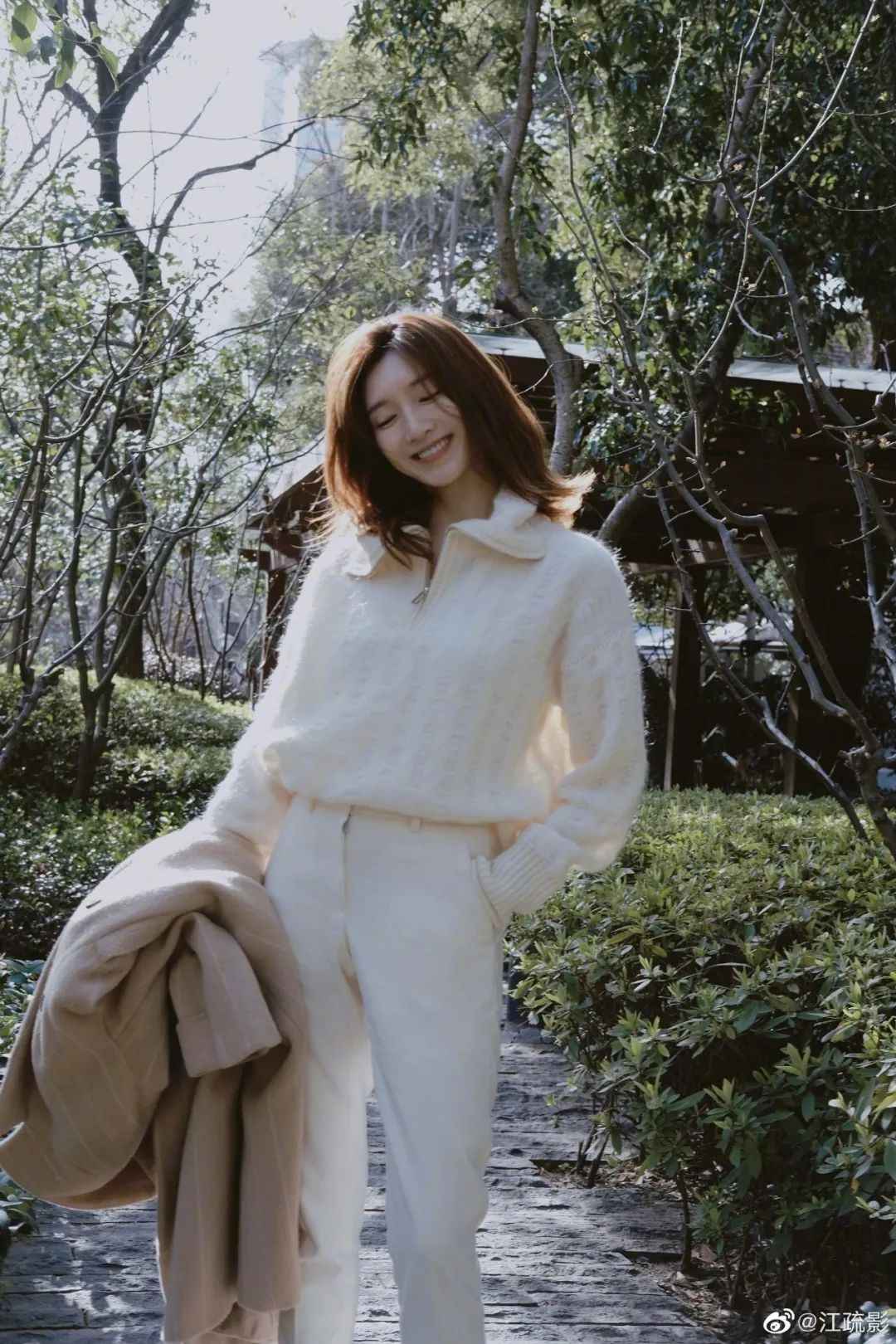 毛衣软糯慵懒,如果下身也宽松会显拖沓,江疏影常穿修身收脚裤提升气质,再塞衣角突出腰线。