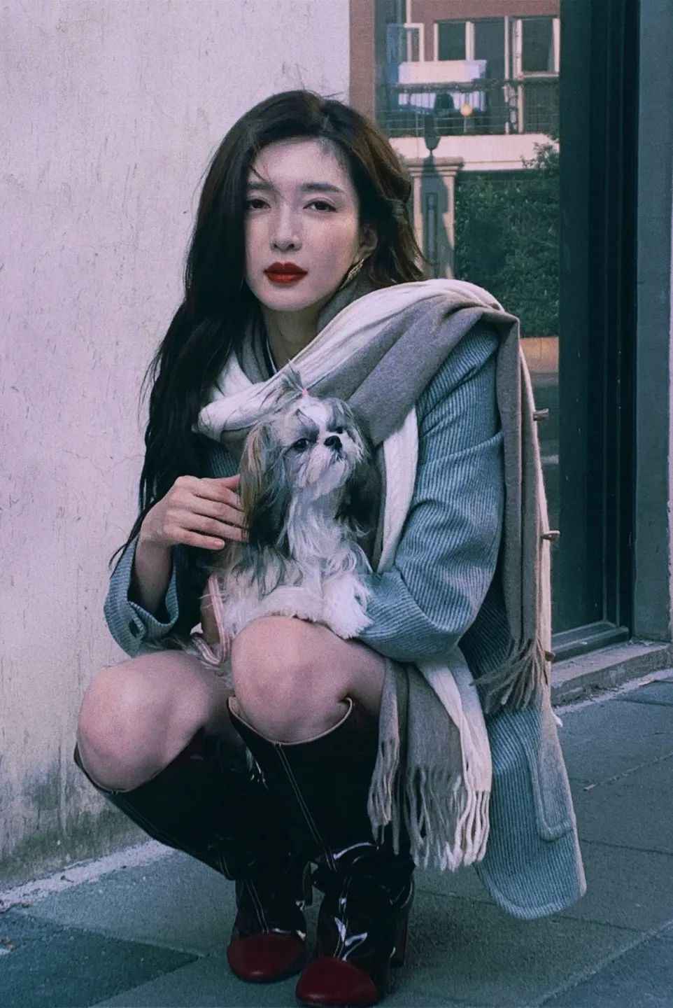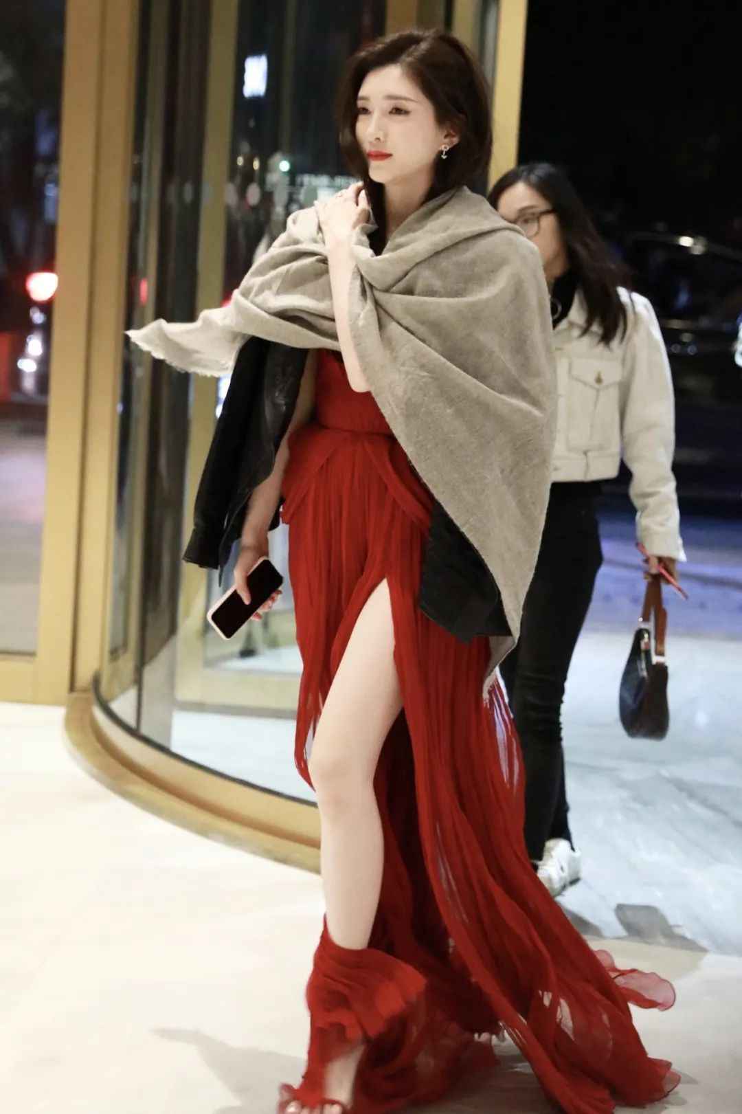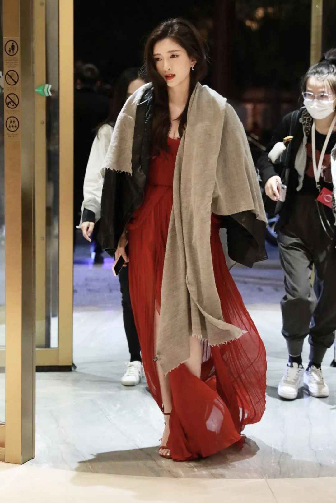 说到秋日氛围,我第一个想到江疏影。一袭红裙把那种优雅破碎感拿捏到位,米色披肩更显沉稳高贵。