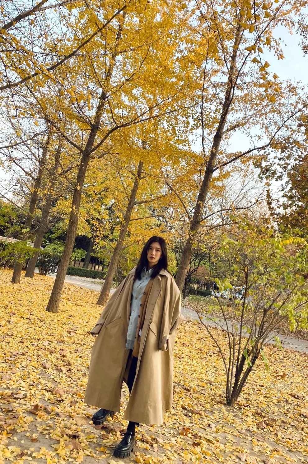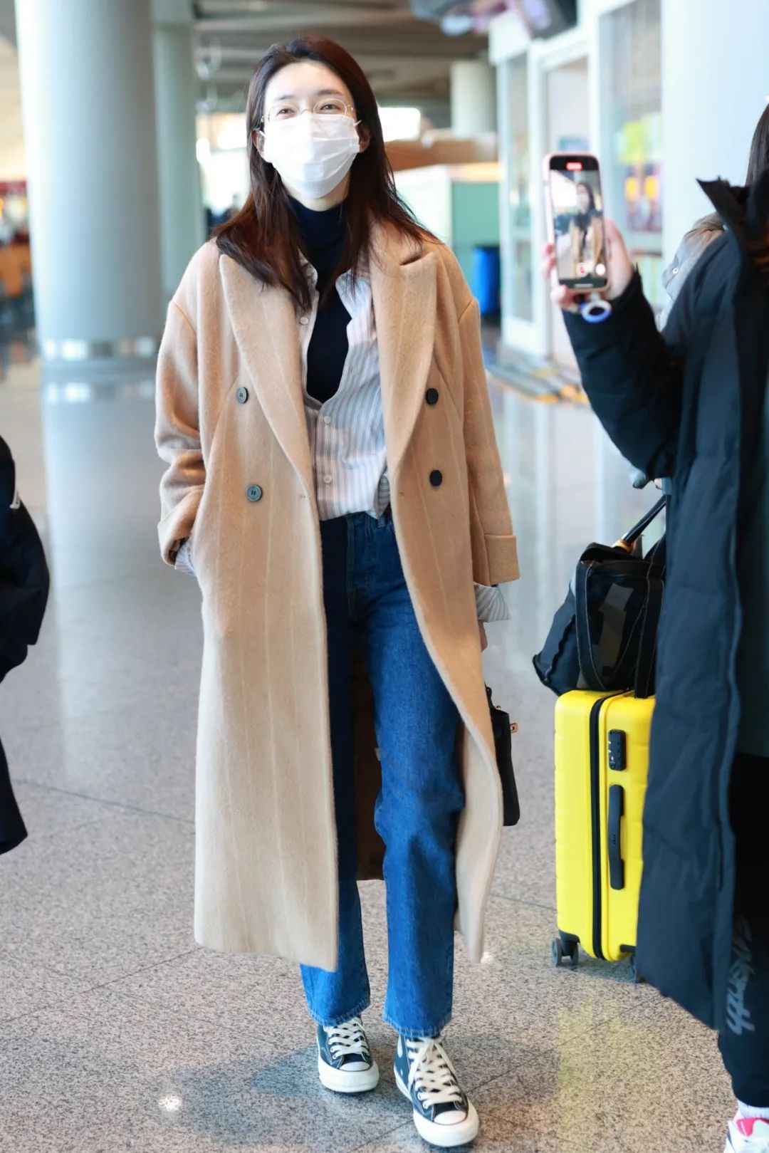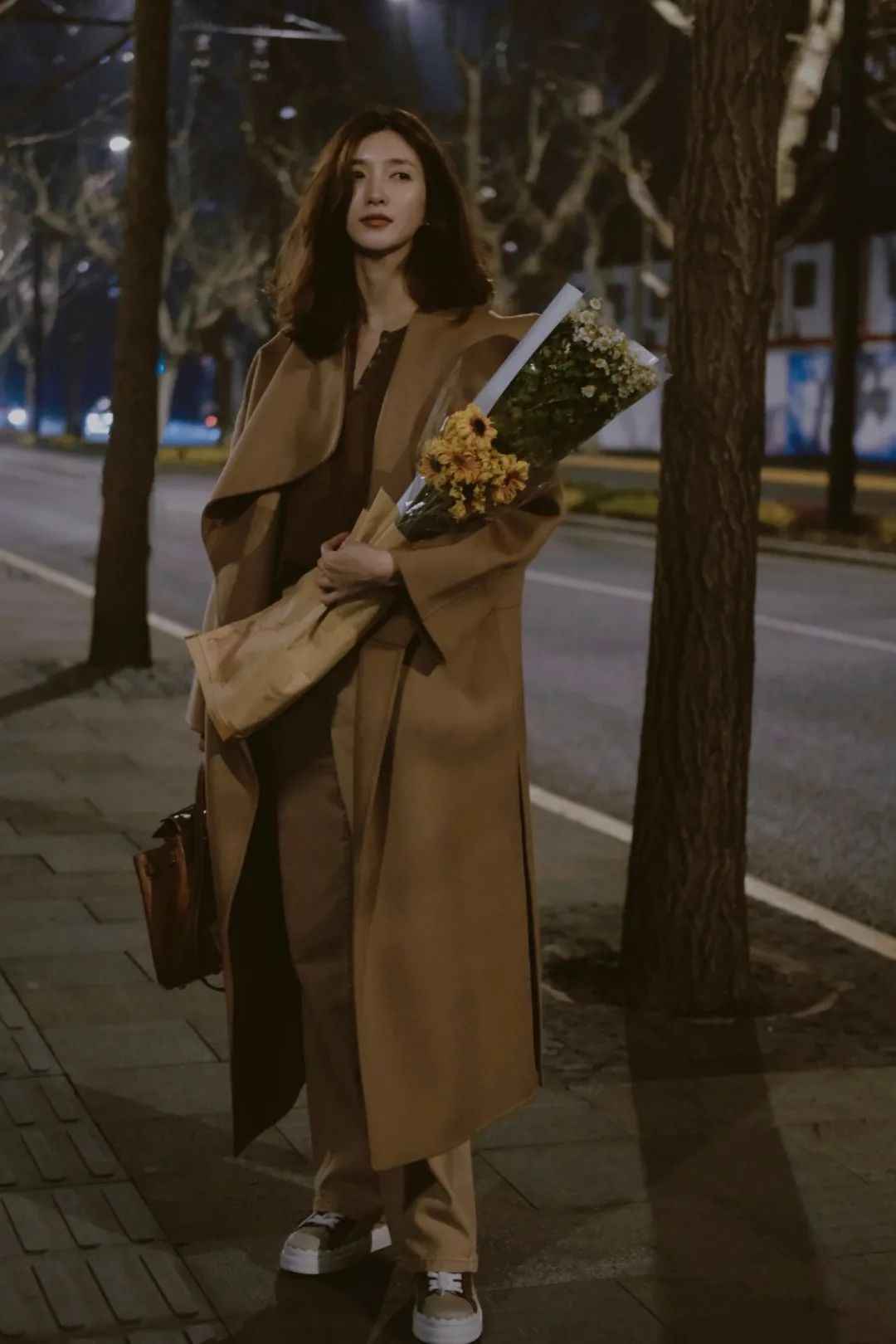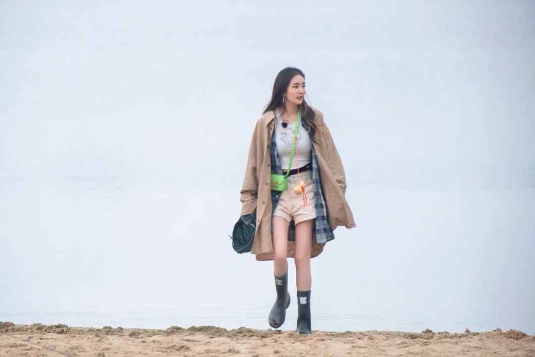 如果你觉得长风衣或大衣不好搭,学学江疏影。她不会用深色裤子配米色大衣,那样容易显老气,而是用同色系打造整体感,或者搭蓝色牛仔裤减龄。
