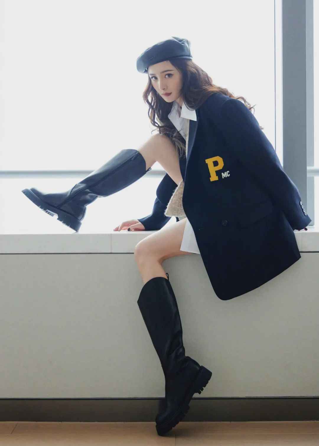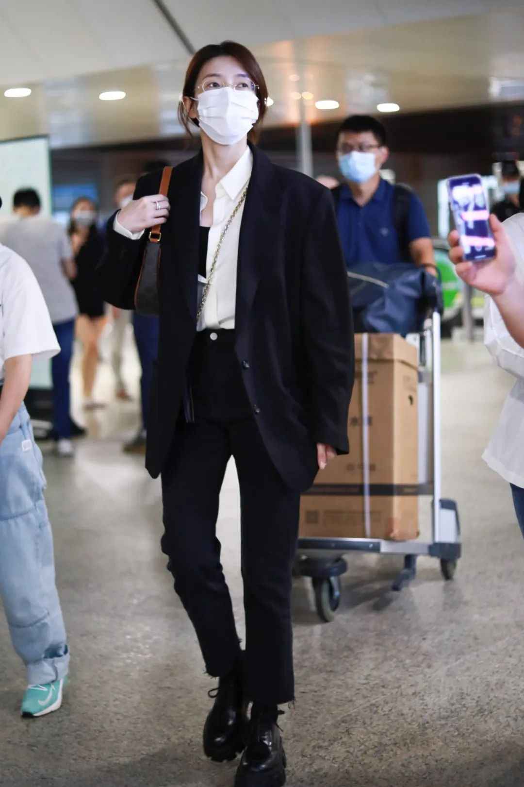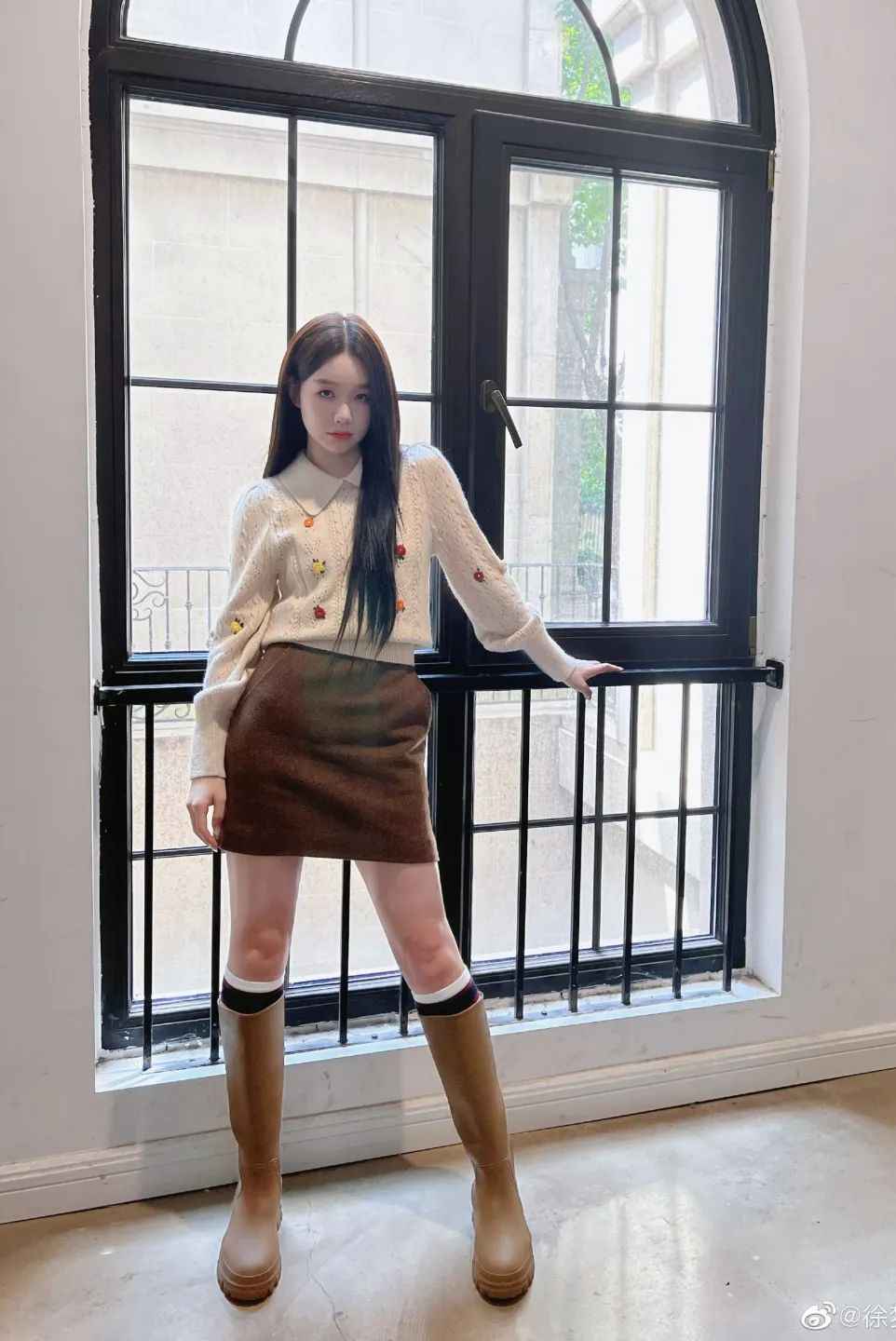 比例很重要,江疏影会用颜色区分上下身,高腰线显得干练,裤靴连贯拉长线条。