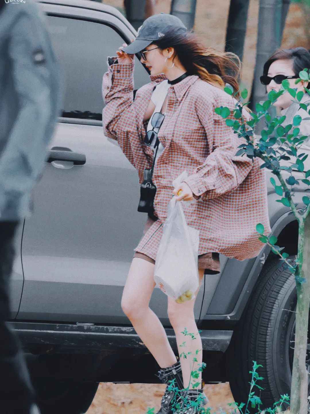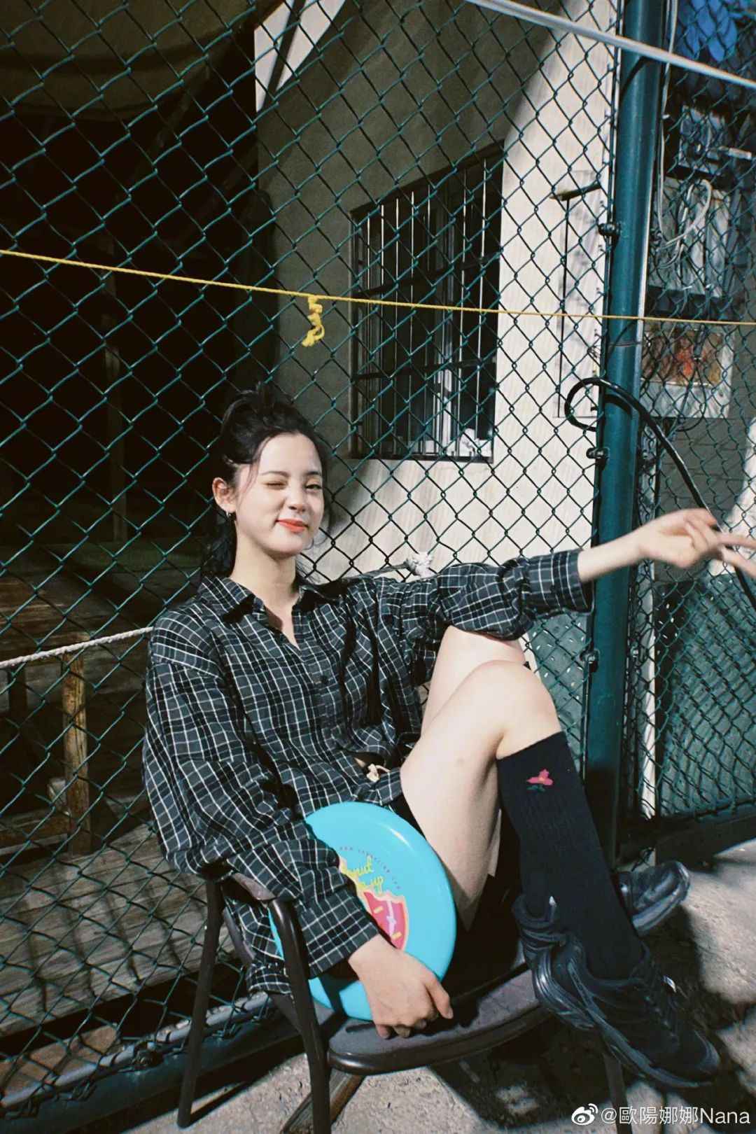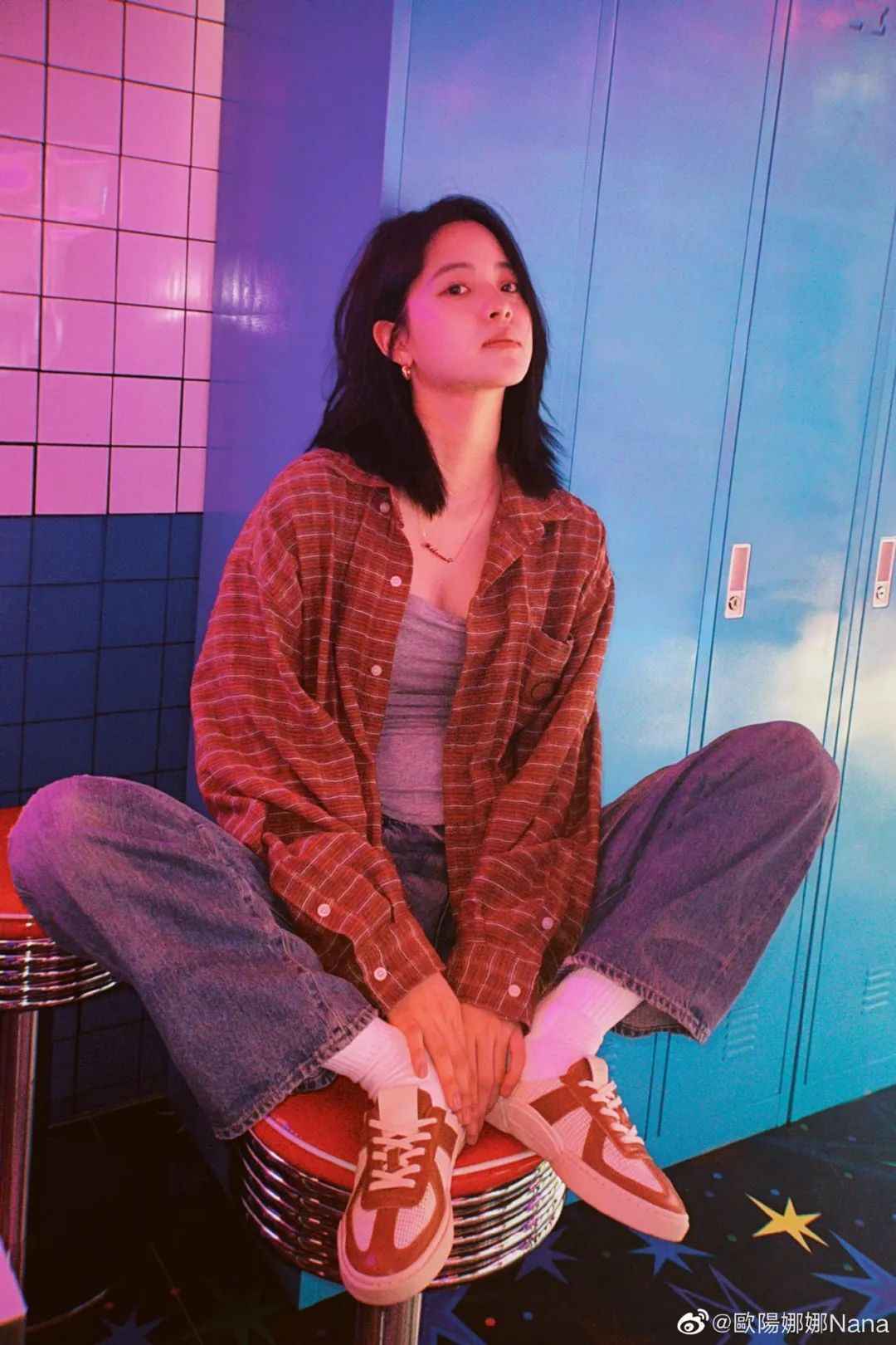 欧阳娜娜也爱格子衫,但常用运动鞋、牛仔裤搭配,显得轻松自在。