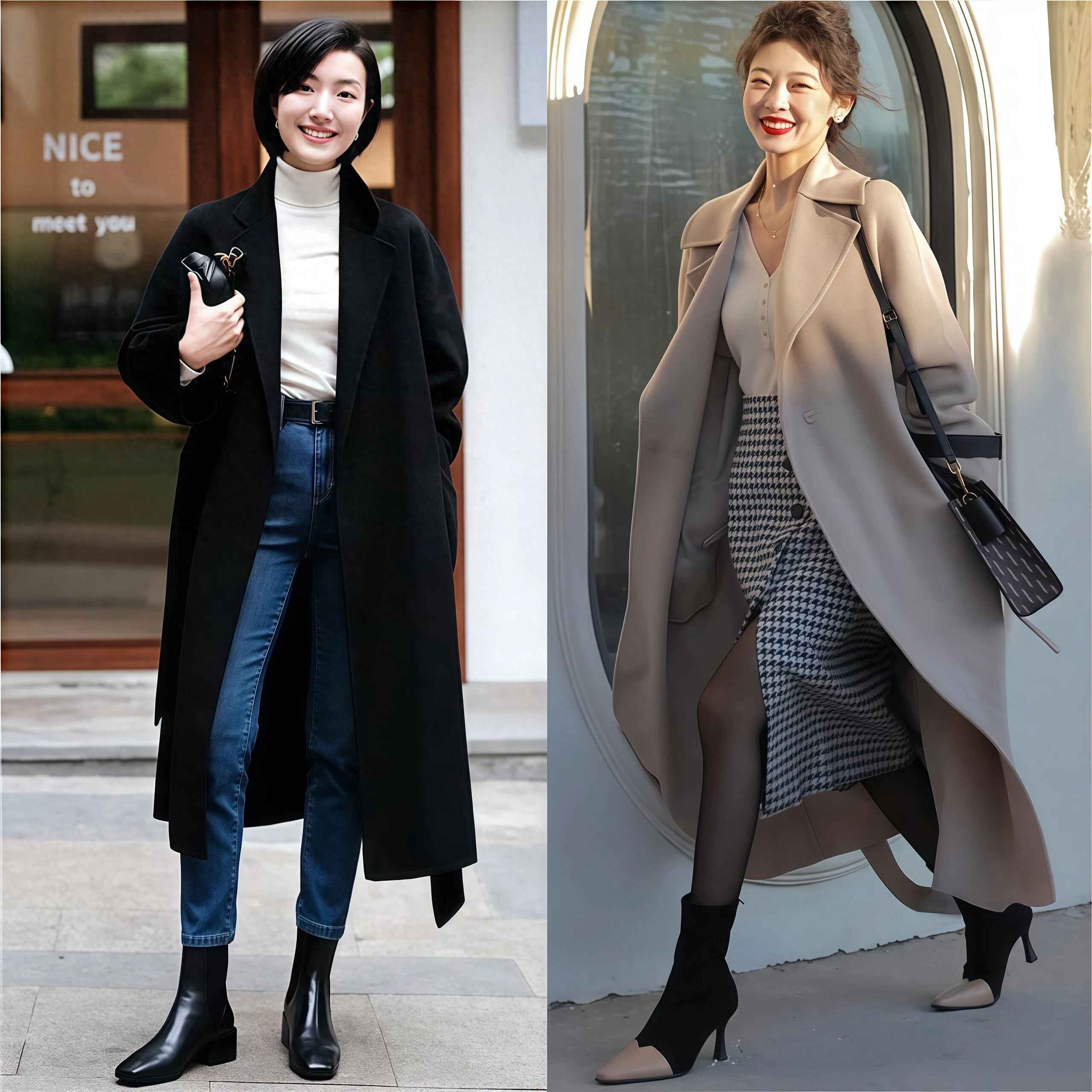 建议选九分裤,或者把长裤卷边,让裤脚和靴口刚好衔接,这样不仅干练,还能突出腿长。