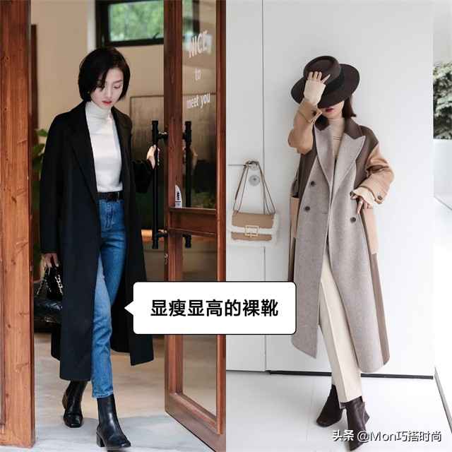 对于矮个和腿粗的姐妹,选裸靴时挑黑色、白色或棕色最稳妥。鞋型选尖头或小圆头,配上小脚裤或半裙,立马拉长腿部比例。